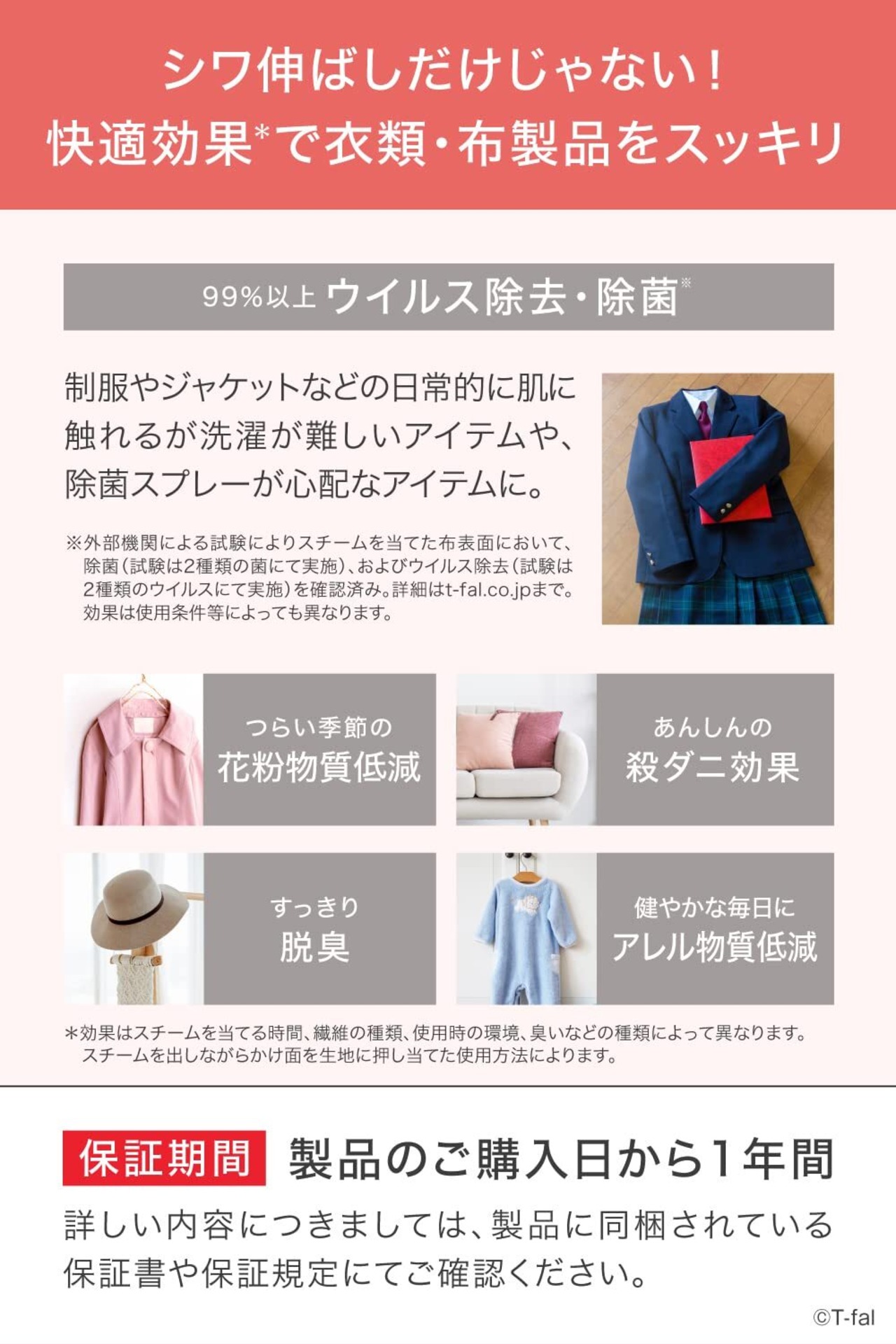 【特長④】『99%以上、ウイルス除去・除菌※』大量のスチームが繊維の奥まで行き渡り、簡単・パワフルに衣類を除菌。菌やウイルスは高温で除去できるため、シワを伸ばしながらしっかりケアが行えます。帰宅後のマスク※のケアや、乳幼児の衣類の仕上げ、肌に触れるのに洗濯が難しいものにオススメです。※効果はスチームを当てる時間、繊維の種類、使用時の環境、臭い等の種類によって異なります。スチームを出しながらかけ面を生地に押し当てた使用方法によります。