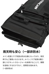 【 雨天対応 】 メイン気室とフロントポケットは防水仕様になっており、雨天時でもご使用いただけます。 メイン/サブポケットの開口部にマグネットクロージャーを採用することで、開閉を容易にするだけでなく、密閉性を高めます。(一部非防水)