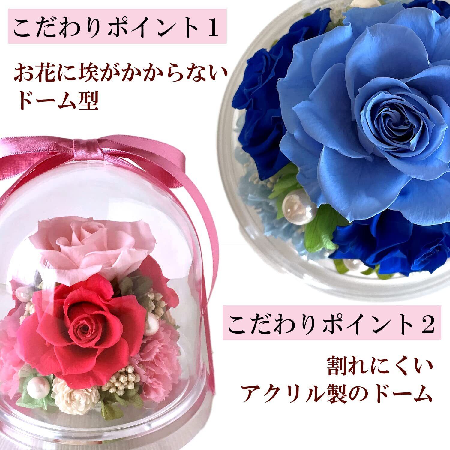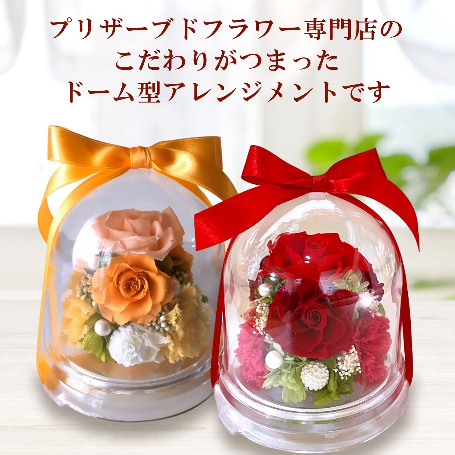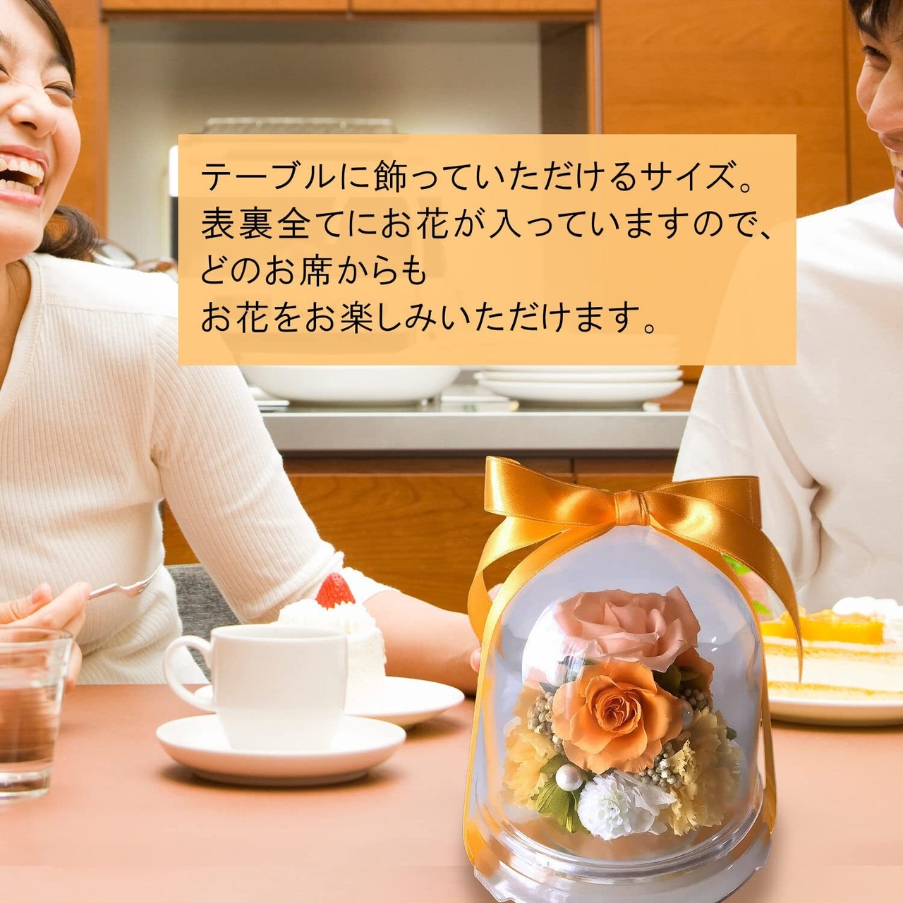 【お花に埃がかからず、お手入れ簡単で、より長く美しく飾っていただけるデザイン】枯れないお花 プリザーブドフラワーをドームに収めたアレンジメントです。 お花に埃がかからず、お手入れが簡単で、より長く美しさを保ちます。ドームは割れにくいアクリル製。配送途中の破損事故の心配が殆ど無く、軽くて持ち運びやすく、また、ペットや小さなお子様の居られるご家庭にも安心です。<ドームの大きさ:直径約13cm 高さ約13cm>テーブルフラワーにおすすめのサイズ。どの角度からでもお花が綺麗に見えるデザインでお作りしています。
