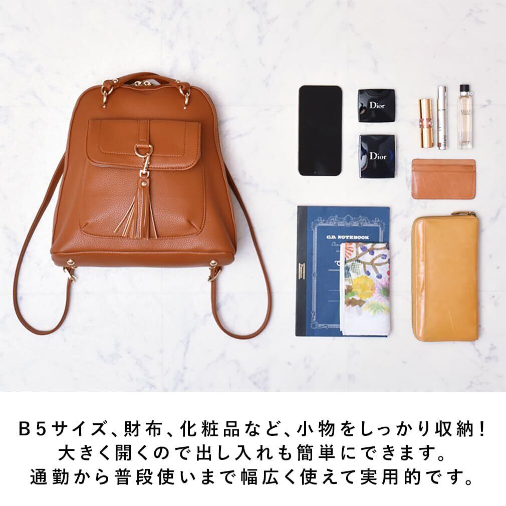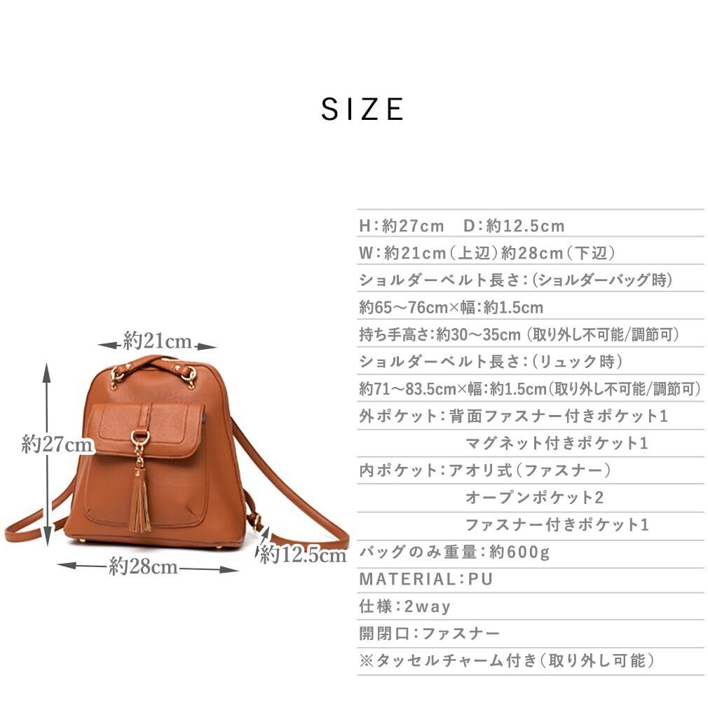 ●SIZE:高さ:約27cm / 幅:約21cm(上辺)約28cm(下辺) / マチ:約12.5cm ●ショルダーベルト長さ(ショルダーバッグ時):約65〜76cm×幅:約1.5cm、持ち手高さ:約30〜35cm(取り外し不可能/調節可) ●ショルダーベルト長さ(リュック時):約71〜83.5cm×幅:約1.5cm(取り外し不可能/調節可) ●外ポケット:背面ファスナー付きポケット1、マグネット付きポケット1 ●内ポケット:アオリ式(ファスナー)、オープンポケット2、ファスナー付きポケット1 ●バッグのみ重量:約600g ●素材:PU ●仕様:2way ●バッグのメイン開閉口はファスナーになっております。 ※タッセルチャーム付き(取り外し可能)