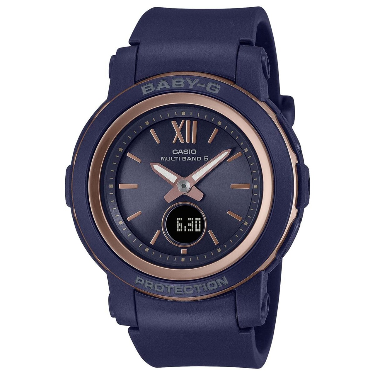 BGA-2900はシンプルでスリムなデザインが特徴。カラーにはどんな服装にも合わせやすい、ブラック、ネイビー、ホワイトをラインアップしました。機能面では、耐衝撃構造や10気圧防水、世界6局の電波を受信し時刻を自動修正するマルチバンド6、ワールドタイム、タフソーラー等、頼れる機能を備えています。