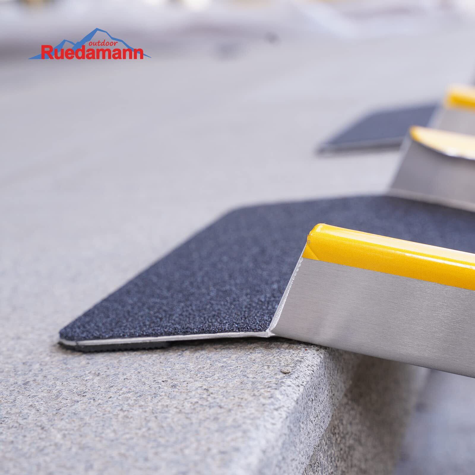 【使用便利】先端の延長プレート設計で接触面積が大きくて、安定性が高いです。バイクラダーの下端は地面にくっつき、バイクなどの設備は簡単に登れます。両サイドチューブの高さは4cmで、使用中設備が落下防止ことができます。黄色表示テープを貼って、夜も見えて使用できるバイクラダーです。
