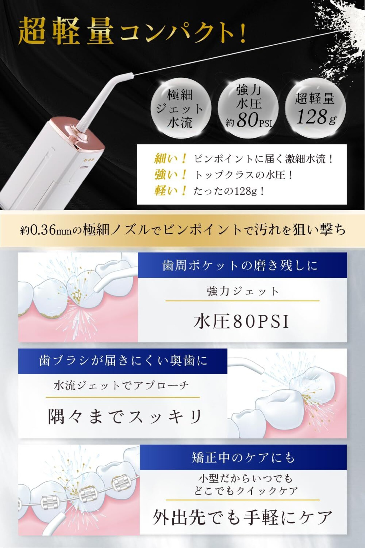 ️【約0.36㎜の極細ノズルで ピンポイントで汚れを狙い撃ち!】約0.36㎜の極細ノズルを採用。水を細く噴射させることにより、適度な水圧とピンポイントの水流で、気になる部分に的確にアプローチ。 水だけのウルトラパワーにより約28~38秒で、歯ブラシやフロスが届きにくい歯間や歯周ポケットの汚れを洗浄します※。 ※ 個人差があります