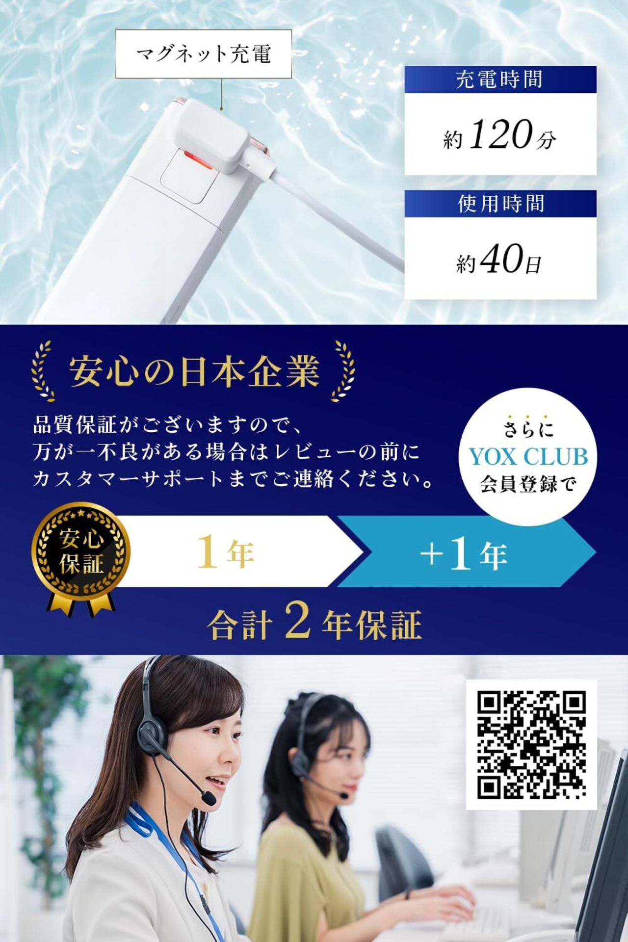 ️【約40日連続使用可能】フル充電で約40日使用できます。長持ちバッテリーを採用しています。 1回約1分間、1日2回の一般的な使用を想定した場合、1回のフル充電 (120分間) で、約40日間の使用が可能です(時間は目安です)。