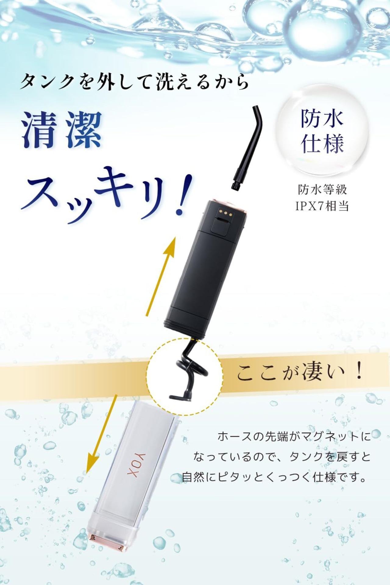 ️【防水機能でお風呂での使用もOK】IPX7※相当の防水機能を搭載。水に強いウォータープルーフボディだから、お風呂でもお口のケアができます。
