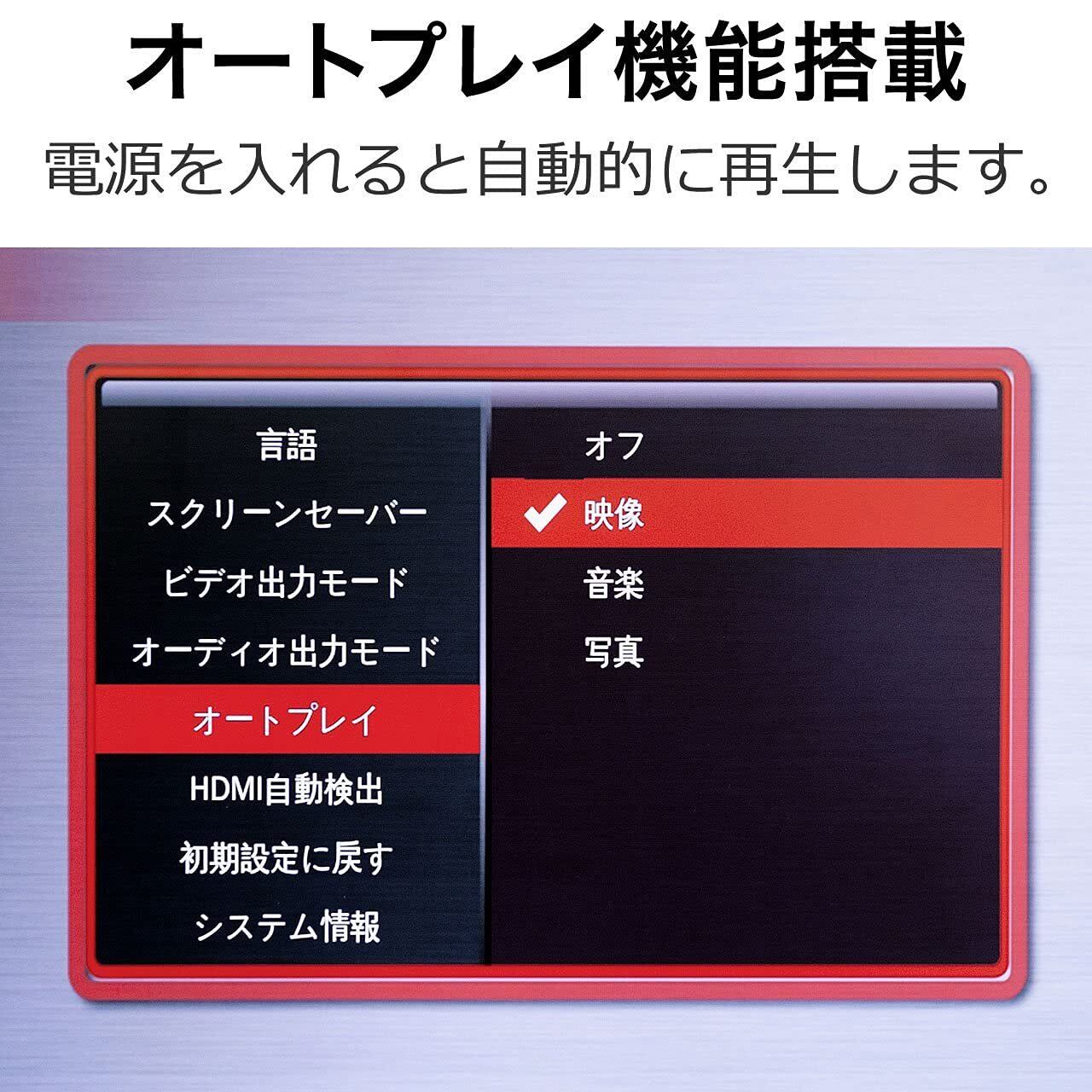 【オートプレイ機能】電源を入れただけで自動で再生できる、オートプレイ機能を搭載しています。設定画面で、「映像」「音楽」「写真」から、選択した種類のファイルが自動で再生されます。【HDMI/RCA出力】付属のHDMIケーブルで出力できるほか、別売りのRCAコンポジットケーブル(400-MEDI001C)を使えばRCA出力も可能です。