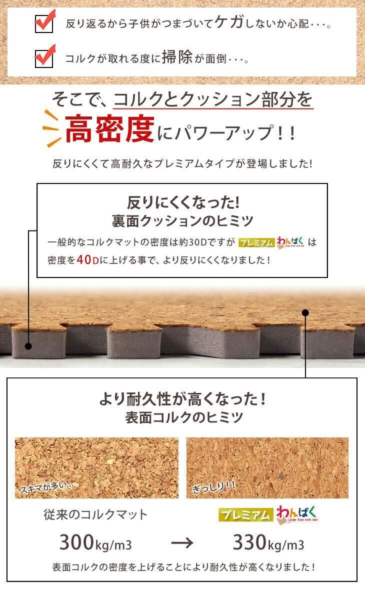 ※従来のコルクマットと色味・サイズが異なります。 追加購入の方は、ご注意ください。 ※コルクは天然素材のため性質上粉が生じたり欠けたりする場合がございます。その場合、 掃除機で吸い取るなどのお手入れが必要となりますので、予めご了承ください。 ※マットの上での暖房器具の使用はおやめください。 ※汚れた場合は固く絞った雑巾で拭き取ってください。水分が隙間に入り込んだ場合はカビ発生の原因となる場合がありますので、定期的にマットを剥がして掃除してください。匂いが気になる場合は、風通しの良いところで干してください。