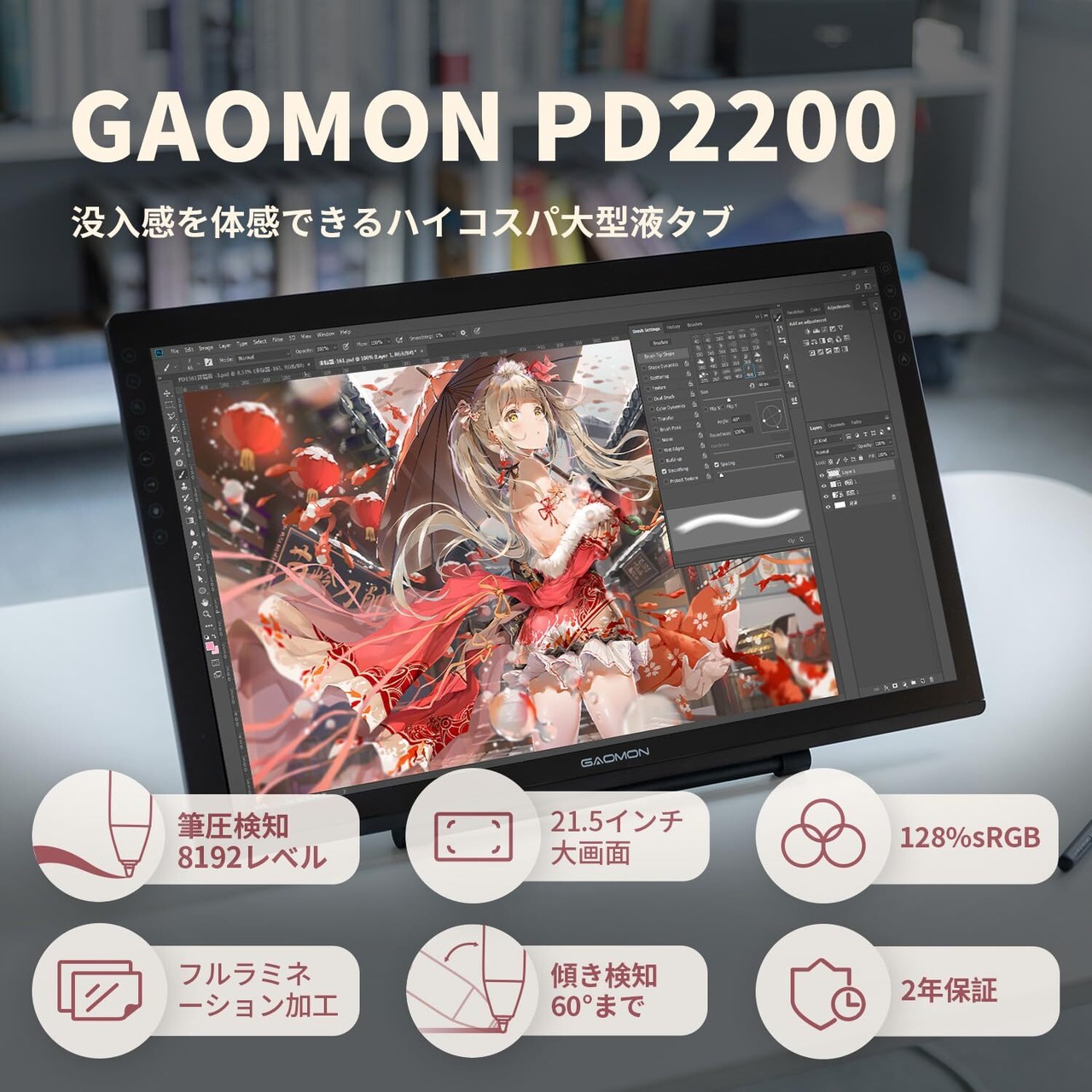 【在庫セール】GAOMON 液タブ PD2200 21.5インチ 92%NTSC IPSパネル フルラミネーション 液晶タブレット 傾き検知 筆圧8192レベル 充電不要ペン イラスト デザイン お絵描き 液晶ペンタブレット 無段階スタンド付き Windows&macOS対応 | ニコニコSHOP