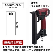 品番T425L SA-T425L-X1T1025L SA-T1025L-X1T425 SA-T425-Z1T1025 SA-T1025Z1本体特徴超軽量ボディ頑丈なダイカストボディ本体材質樹脂ダイキャスト重量730g1230g本体サイズL235XW55XH188mmL235XW55XH188mmL239XW61XH188mmL239XW61XH188mmステープル種類4Jステープル10Jステープル4Jステープル10Jステープル共通の商品情報ステープル装填本数100本使用空気圧範囲0.5~0.8MPa使用オイルタービンオイルISOVG32ステープル足長10~25mm鋼線太さ0.6X1.2mmセット内容付属品本体・サンプルネイル・安全グラス・ネイラーオイル・ケース・取扱説明書