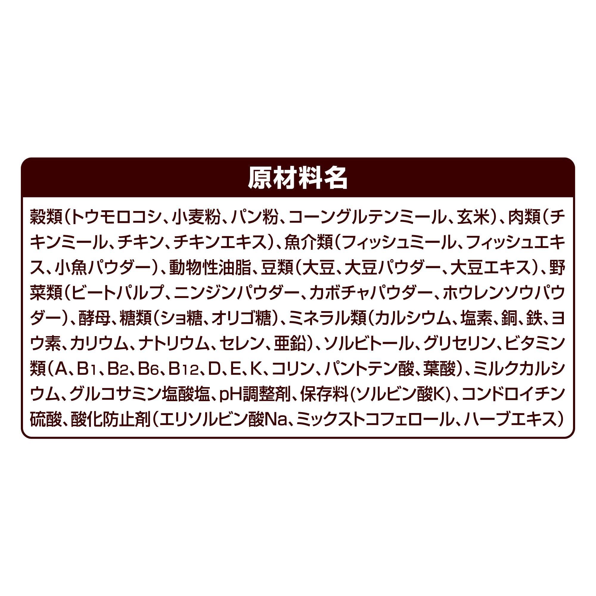 【原材料】 穀類(トウモロコシ、小麦粉、パン粉、コーングルテンミール、玄米)、肉類(チキンミール、チキン、チキンエキス)、魚介類(フィッシュミール、フィッシュエキス、小魚パウダー)、動物性油脂、豆類(大豆、大豆パウダー、大豆エキス)、野菜類(ビートパルプ、ニンジンパウダー、カボチャパウダー、ホウレンソウパウダー)、酵母、糖類(ショ糖、オリゴ糖)、ミネラル類(カルシウム、塩素、銅、鉄、ヨウ素、カリウム、ナトリウム、亜鉛)、ソルビトール、グリセリン、ミルクカルシウム、ビタミン類(A、B1、B2、B6、B12、D、E、K、コリン、パントテン酸)、グルコサミン塩酸塩、pH調整剤、保存料(ソルビン酸K)、酸化防止剤(エリソルビン酸Na、ミックストコフェロール、ハーブエキス)、コンドロイチン硫酸 【保証成分】 タンパク質21.0%以上、脂質11.0%以上、粗繊維4.5%以下粗灰分8.5%以下水分12.0%以下 【エネルギー】 約360kcal/100g