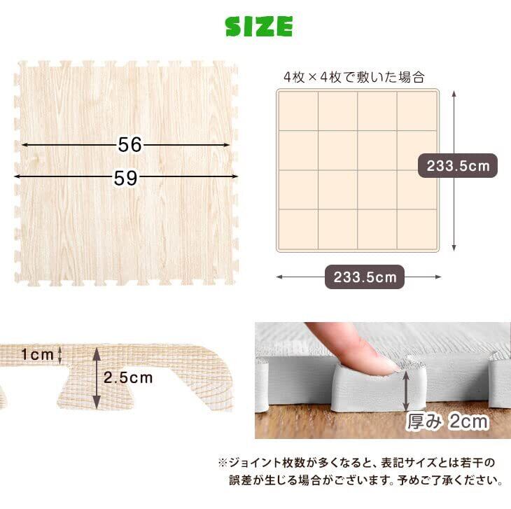 ・製造時期によっては若干色味が異なる場合がございます。 ・従来の木目調ジョイントマットと若干サイズ・色味が異なりますので、追加注文の際はご注意ください。 ・直射日光や温度・湿度によりマットが反る場合があります。その際は軽く逆反りをさせてご使用ください。 ・マット毎に若干の色・柄などの違い、見る角度による色の違い等がありますが、使用上の品質には問題ございません。 ・生産上マットをカットする際に生じた粉末が付着している場合がございます。 一度綺麗に水拭きしてからご使用ください。色落ちではありませんので、ご安心ください。 ・重量物を載せますと、マットが凹み変形する恐れがあります。 ・床暖房の種類等によって、商品に多少の反りが生じる場合がございます。予めご了承ください。 ・商品の仕様上、ジョイント部分(サイドパーツ含む)の 木目の柄は合わない場合がございます。 ・表面の凹凸の深さに若干の個体差がある場合がございます。