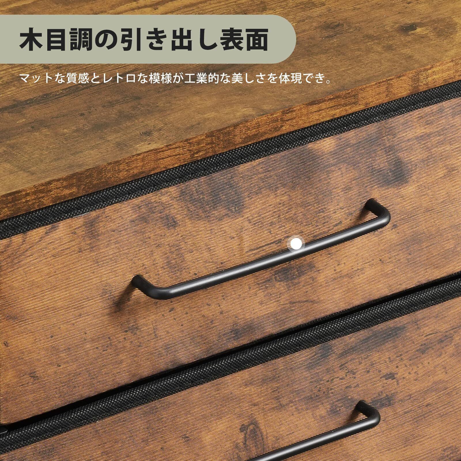 【温かみのあるデザイン】布制のキャビネットに木目調の引き出し表面と質感のある木制の天板を組み合わせました。シンプルなデザインと落ち着いた色合いで、単体の使用でも違和感なくインテリアになじみます。オフィスや寝室、リビングなど、さまざまな場所で使用できます。