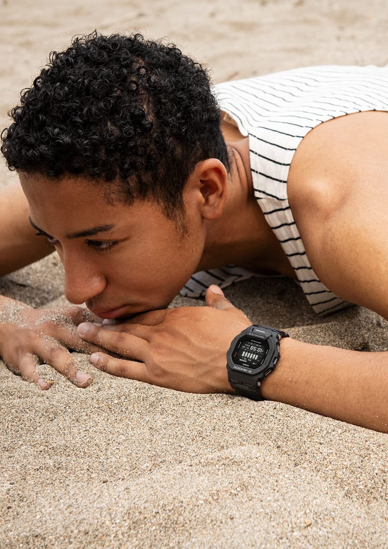 飽くなきタフネスを追求するG-SHOCKのスポーツライン「G-SQUAD(ジー・スクワッド )」です。初代G-SHOCKから受け継がれるスクエアフォルムに加速度センサーや距離計測機能、スマートフォン連携機能等、ランニングなどのトレーニングに役立つ機能を搭載しました。スマートフォンのGPS 機能と連携することで、加速度センサーによる計測距離を補正。一度補正すると次回から時計単体でより正確な走行距離の計測ができます。更に走行ペースの計測や一定距離を走行するたびに自動でタイムを計測するオートラップ機能も可能になります。また、時計の各種設定やトレーニングの管理に役立つ専用アプリ「G-SHOCK MOVE」とつなげることでライフログやアクティビティ履歴などを確認できるほか、設定した目標に合ったトレーニングプランを自動作成。毎日のトレーニングをサポートします。ディスプレイには高精細MIP液晶を採用。G-SHOCKらしいガジェット感を演出するフロントボタンを押すと、スーパーイルミネーターのライトが点灯し、暗所での視認性にも配慮しました。バンドにはソフトウレタン素材を使用しフィット感を高めるとともに、細かくフィッティング調整ができるようバンド穴の数を多く設けています。また、BluetoothⓇ接続による自動時刻修正や通知機能※、ライフスタイルに役立つ性能も身につけました。日常の健康管理からランニングの持久力強化まで、幅広く役立つG-SHOCKです。※トレーニング中の経過時間や消費カロリーなどのアラート機能と、BluetoothⓇ接続しているスマートフォンの電話・メール・SNS着信などの各種通知を振動でわかりやすく報知してくれるバイブレーション機能。