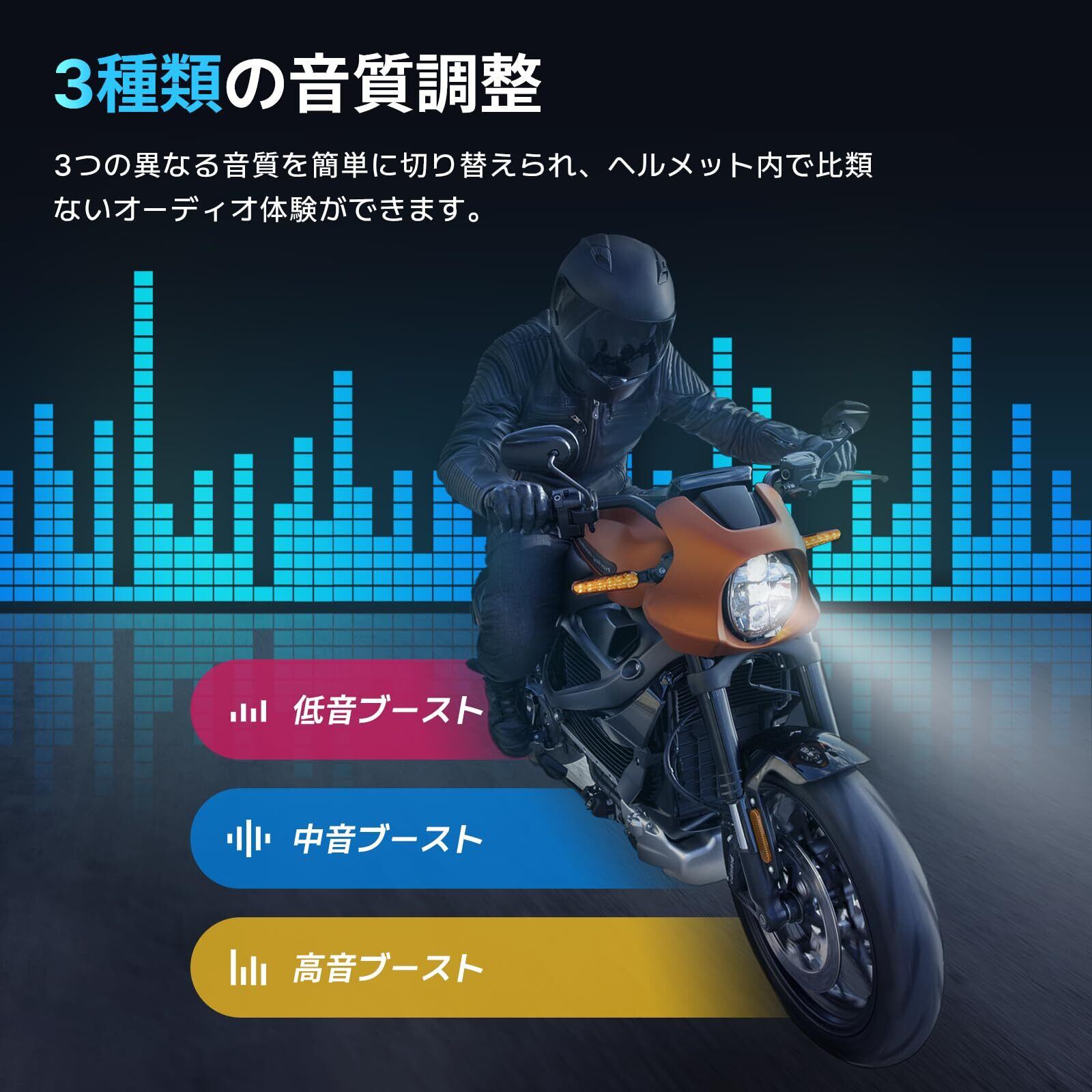 【3つのサウンド調整とアンビエントサウンド受信モード】 T4Xは、臨場感あふれるオーディオ体験を提供する3つのバランスサウンドエフェクト(バスブースト、ミッドレンジブースト、トレブルブースト)を搭載しています。また、走行中に周囲の音を拾うことができるアンビエントサウンドレセプション機能も搭載しており、より安全で安心な走行体験を提供します。 T4Xはまた、2人のライダーが走行中に同じ音楽を楽しめるミュージック・シェアリング機能も備えている