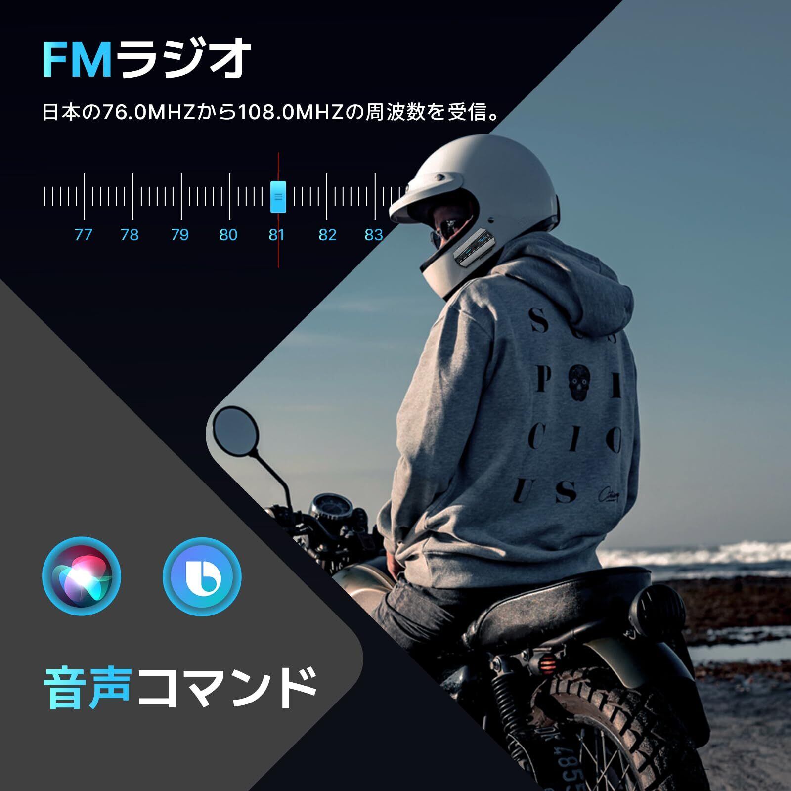 【大容量バッテリー&防水規格IP67&FM機能】 T4X バイク インカムは1000mAhのリチウムポリマーバッテリーを搭載しており、最大40時間の音楽再生、40時間の通話、700時間の待機時間を実現しています。T4X バイク用インカムは防水性能IP67で、いつでもお使いいただけます。砂埃、雨、暴風雨、雪、0°Cまでの低温など、過酷な気象条件にも対応することができます。こちらの製品はFMラジオ機能も備わっており、日本各地のFM放送を受信することができます