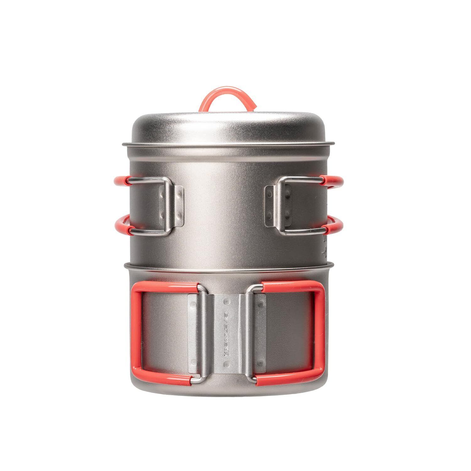 軽量化と使いやすさを両立させた究極のソロクッカーセット。750mlサイズのポットと「Ti 400FD Cup」がセットになっています。110サイズのガスカートリッジと小型ガスストーブが収納可能。