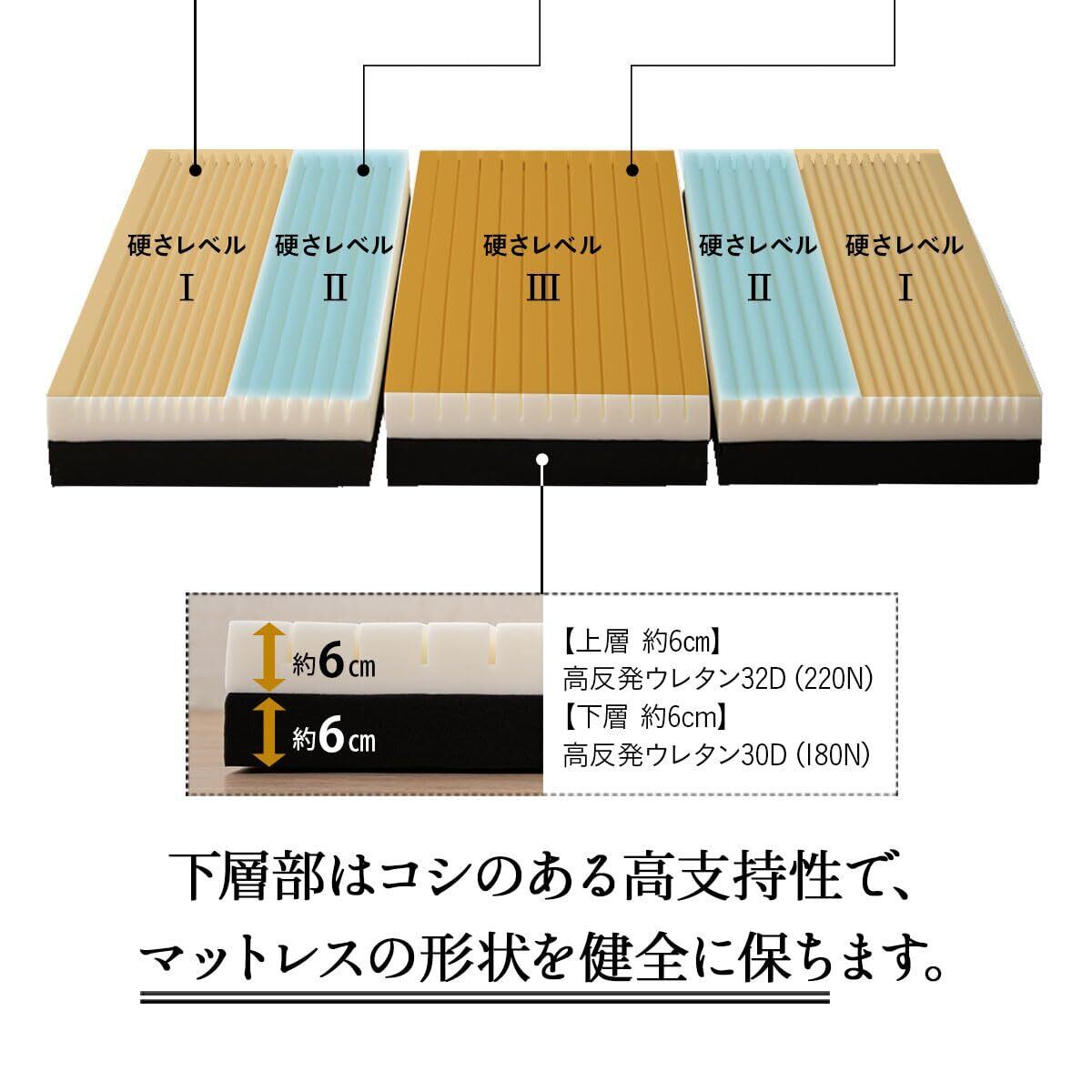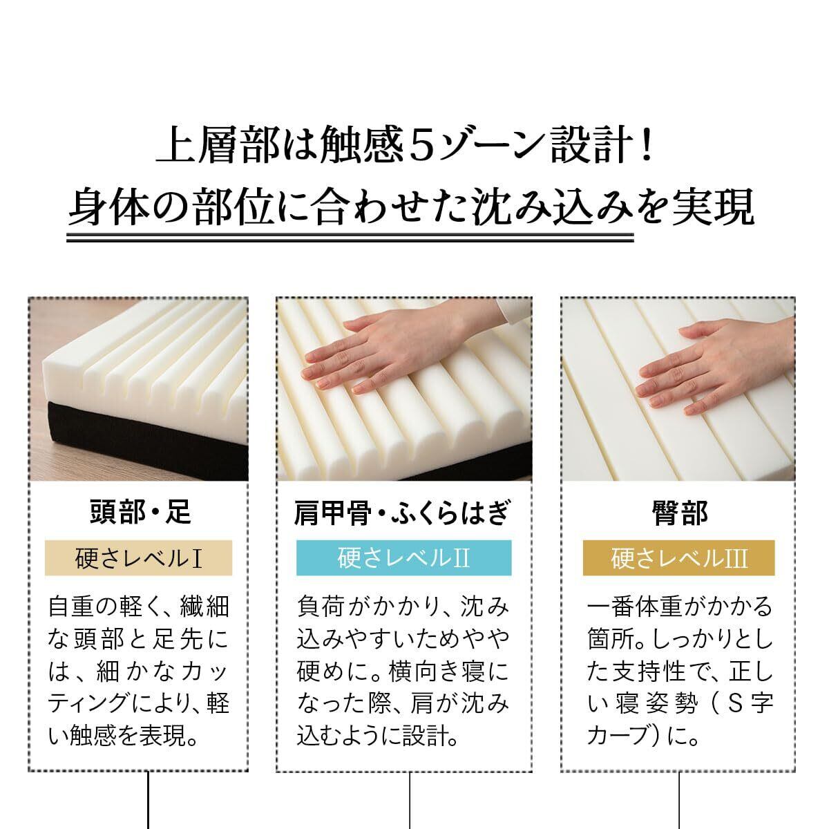 上層部は身体の部位に合わせた沈み込みを実現 ・頭部/足 自重の軽く、繊細な頭部と足先には、細かなカッティングにより、軽い触感を表現。 ・肩甲骨/ふくらはぎ 負荷がかかり、沈み込みやすいためやや硬めに。横向き寝になった際、肩が沈み込むように設計。 ・臀部 一番体重がかかる箇所。しっかりとした支持性で、正しい寝姿勢(S字カーブ)に。 下層部はコシのある高支持性で、マットレスの形状を健全に保ちます。