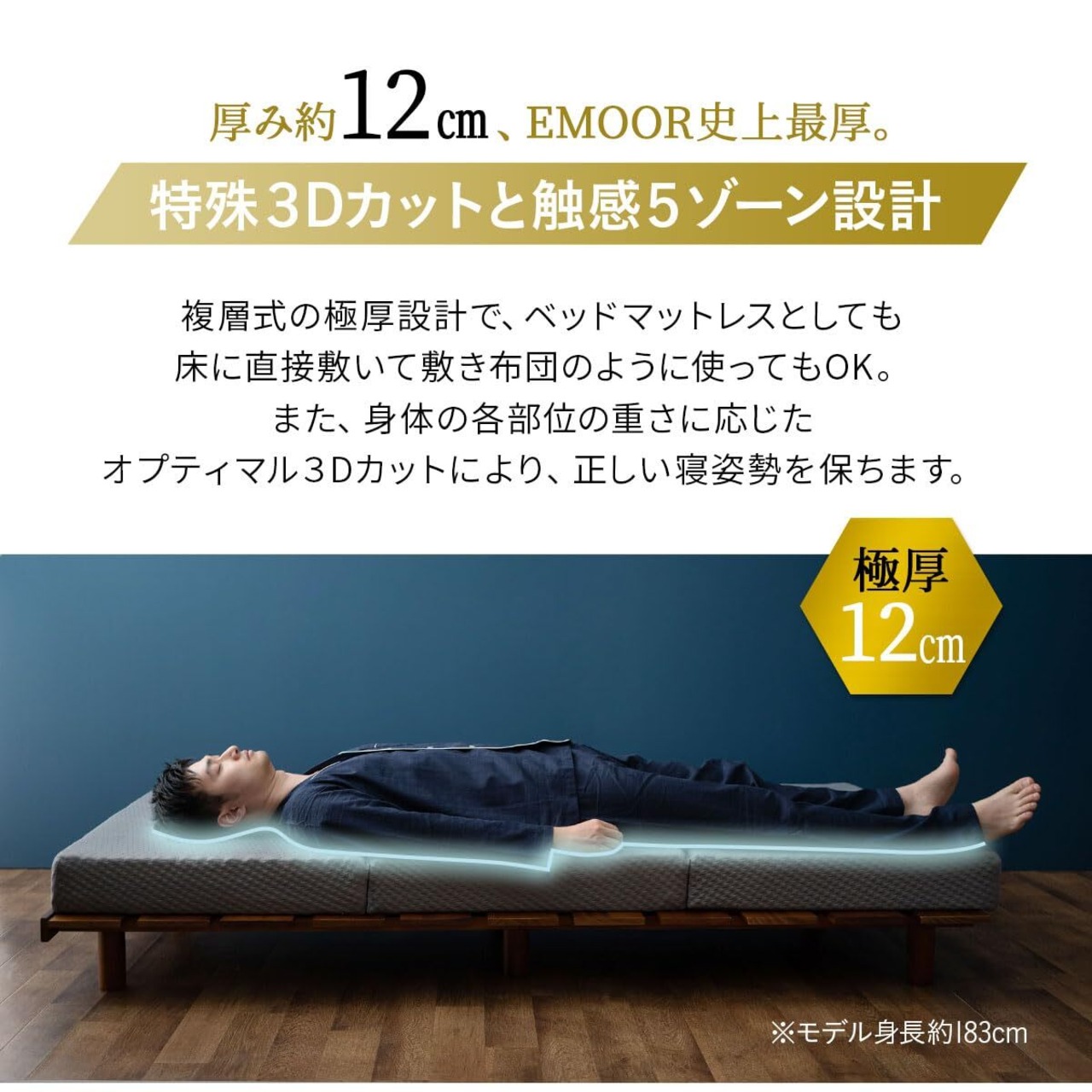 特殊3Dカットと触感5ゾーン設計 厚み約12cm、EMOOR史上最厚。 ベッドマットレスとしても、床に直接敷いて眠ってもOK。 身体の各部位の重さに応じたオプティマル3Dカットにより、正しい寝姿勢を保ちます。