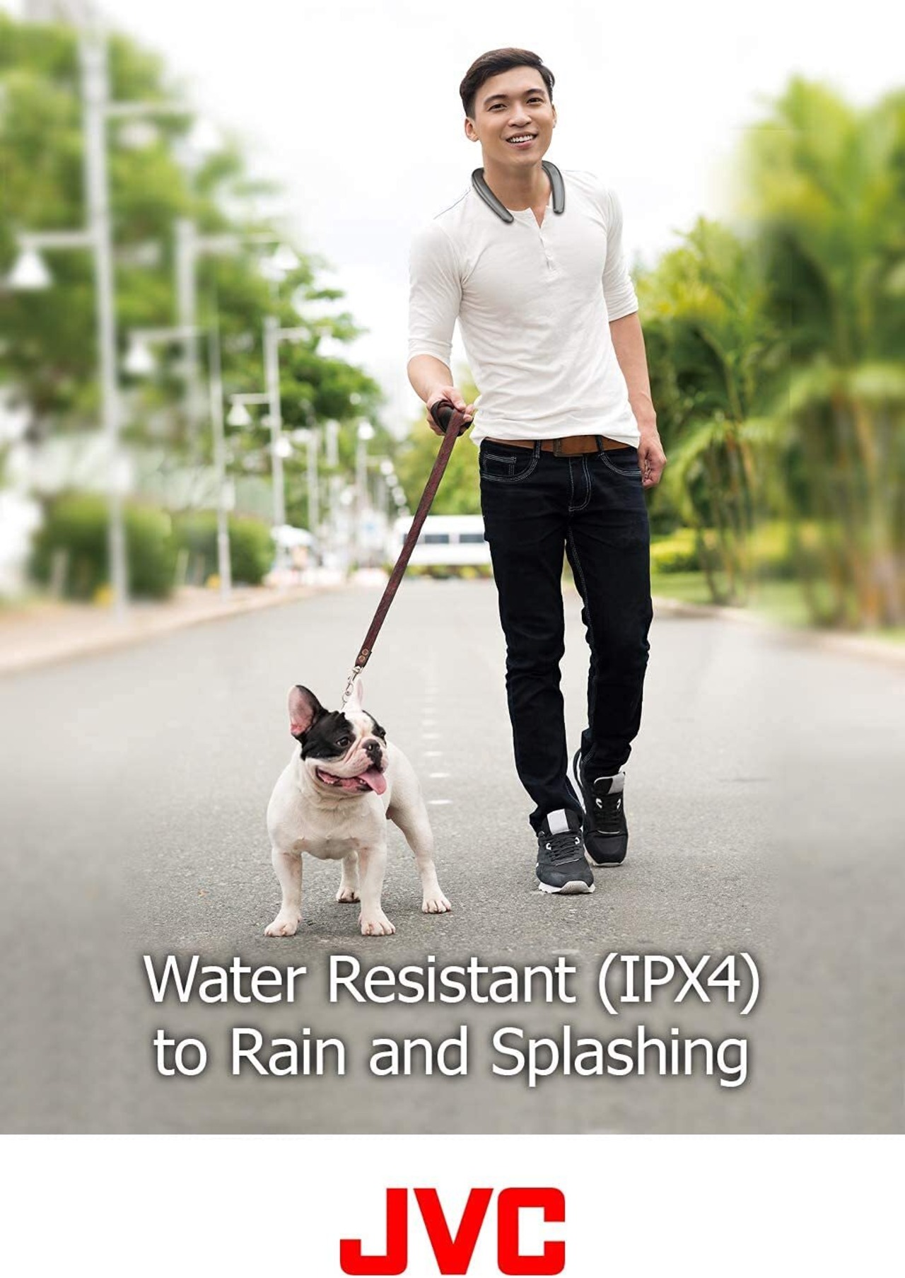 雨や水しぶきを気にせず使える生活防水に対応※1。キッチン周りや屋外での散歩など、日常のさまざまなシーンでテレビ音声や音楽を楽しめます。※1: JIS保護等級4級(IPX4)相当