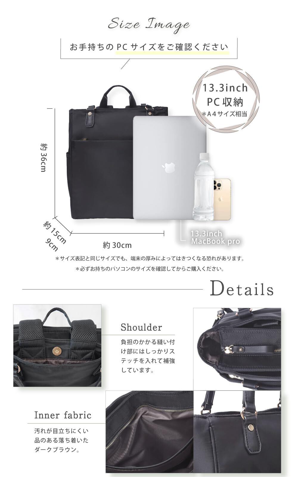 【ビジネスアイテムがきちんと収まる収納力】邪魔にならないコンパクトなサイズ感ながら、底マチのある台形シルエットで収納力アップ!13.3inchまでのPCが収納できるサイズになっています。【女性を魅了する多彩な14ポケット】小物、PC、書類が分けれられて、誰でも収納上手になれる14個の多彩な小分けポケットがついています。【ショルダーベルト・手持ちハンドルは収納可能】トートバッグとして使用する場合は、ベルト部分は背面ポケットに格納できます。ベルト部分には、収納しやすいように折り目がついています。反対にリュックとして使用する場合は、トートバッグのハンドル部分を背面ポケットに収納できる設定になっています。