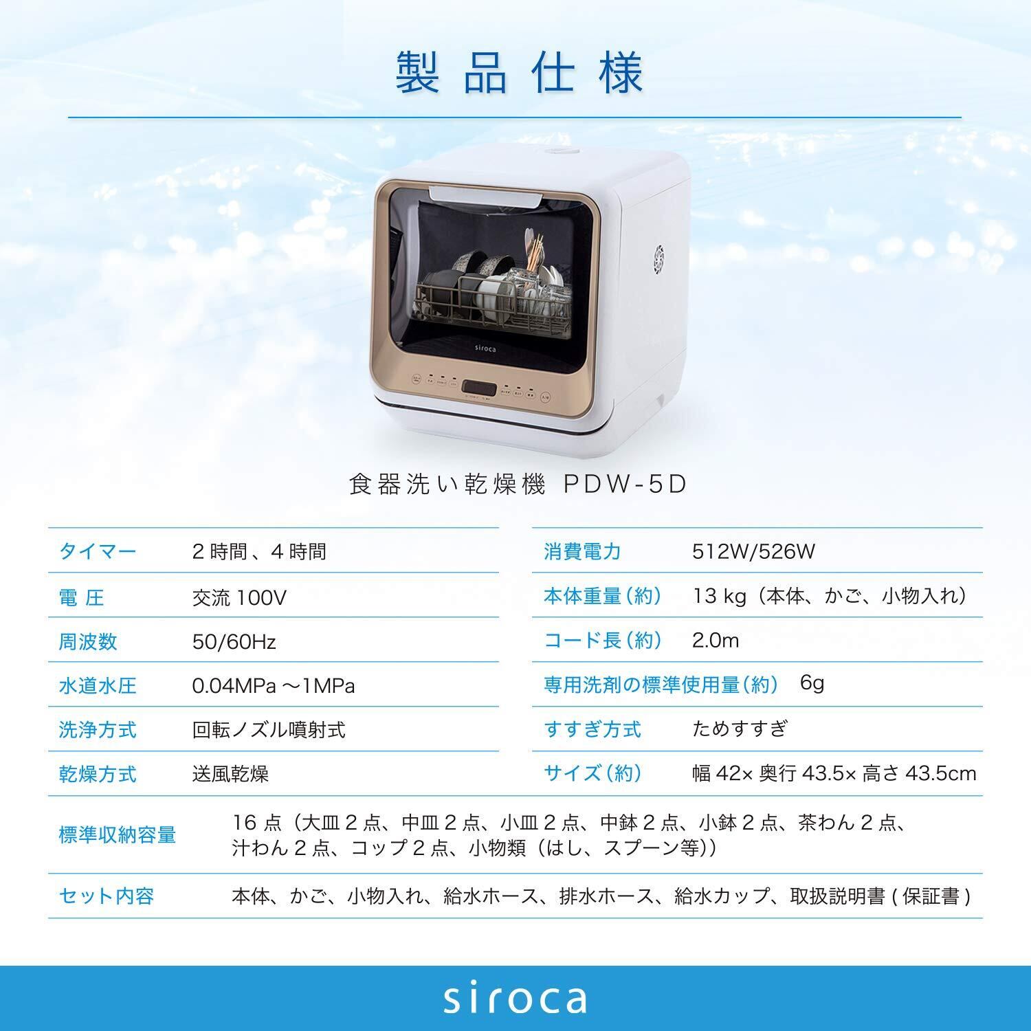 シロカ 2WAY食器洗い乾燥機 [食洗機/工事不要/分岐水栓対応/液晶表示付き/タイマー搭載/360℃キレイウォッシュ] PDW-5D (ゴールド)