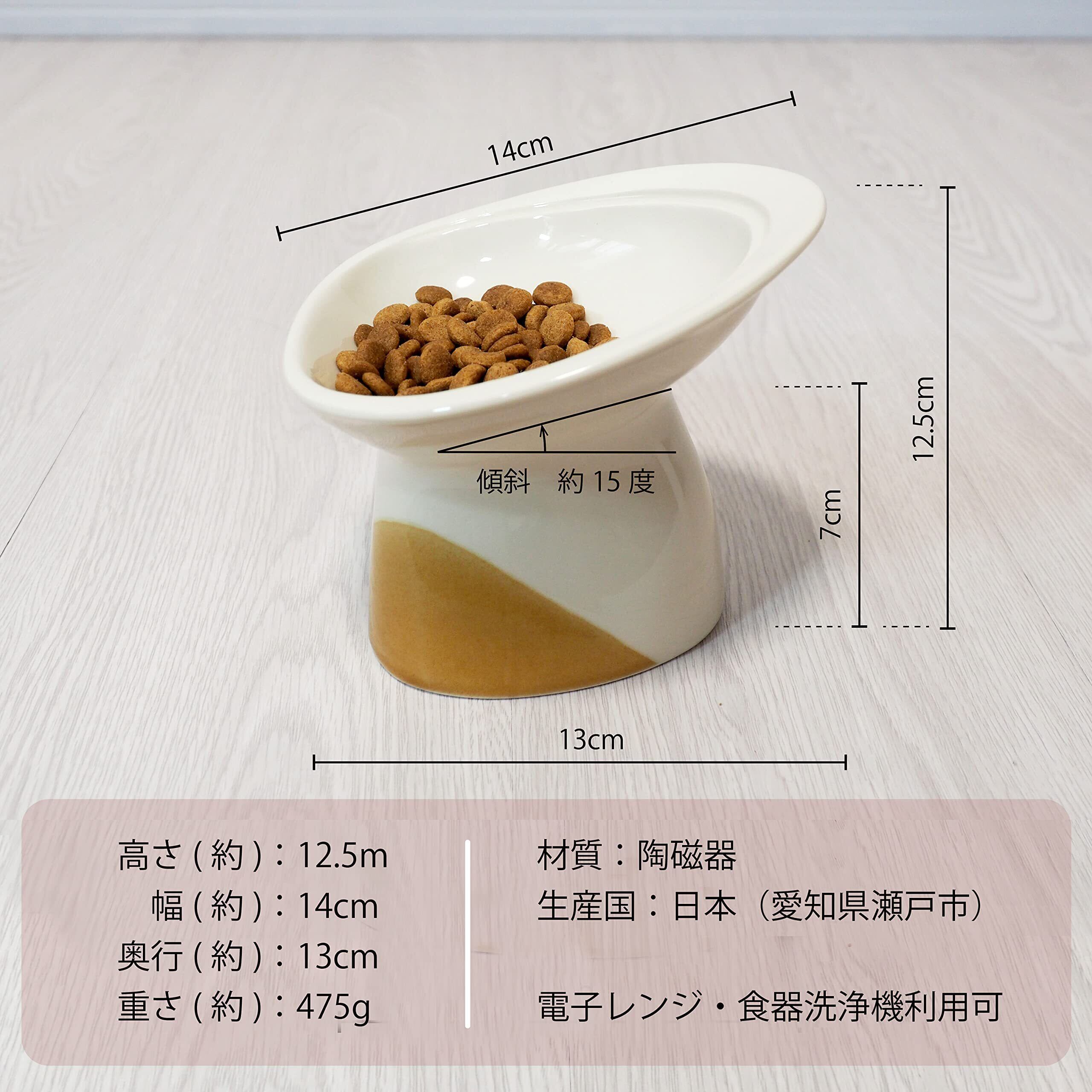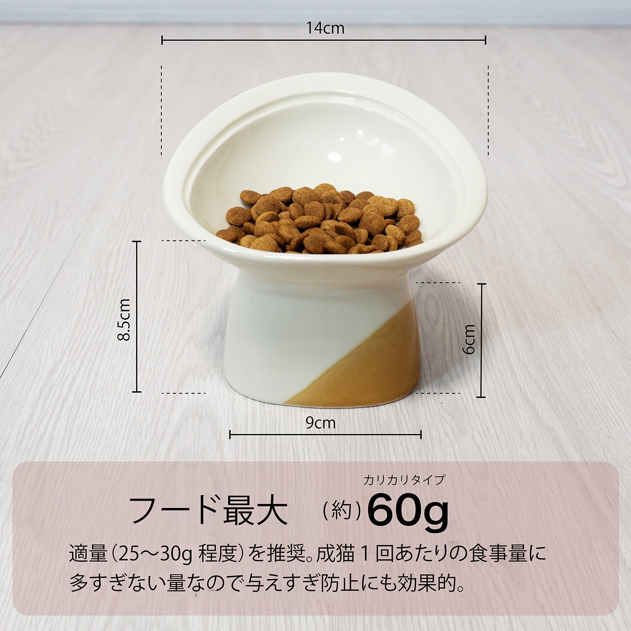 【スペックほか】サイズ:(約)高さ12.5cm×幅14cm奥行13cm、重 さ:(約)475g、材 質:陶磁器(瀬戸焼)、生産国:日本(愛知県瀬戸市)、容量:カリカリで最大(約)60gほど。ただし、適量(25〜30g程度)での給餌を推奨。成猫1回あたりの食事量に多すぎない量なので、与えすぎ防止にも効果的。ウェットタイプのフードにもおすすめ、その他:電子レンジ・食器洗浄機利用可