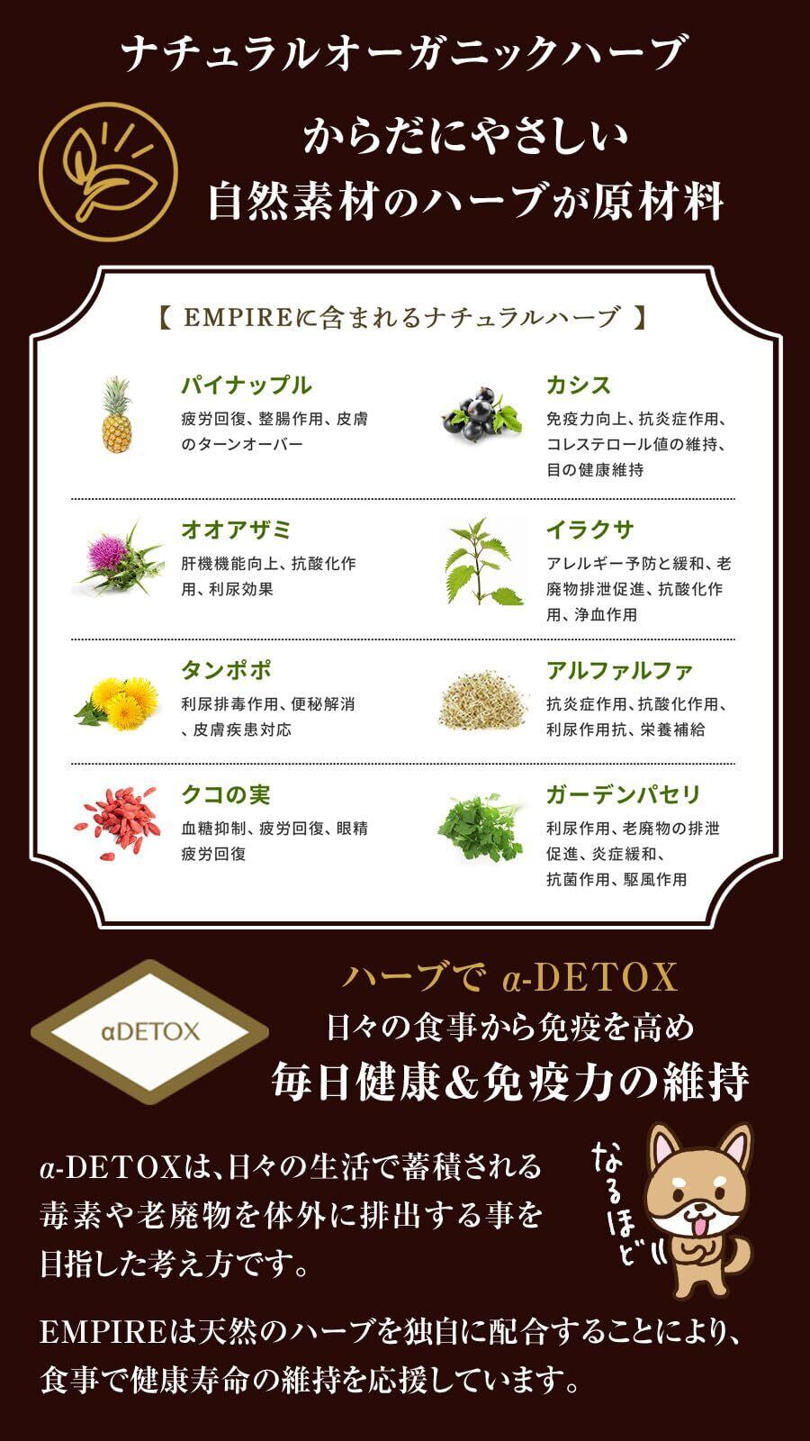 多くのジビエ肉を使用した健康的で低アレルギー、チキンフリー、グレインフリー、グルテンフリーの食事です。新鮮な鹿肉・キジ肉・ヤマウズラ肉・鴨肉を採用し、素晴らしい嗜好性を実現。冷凍肉すら使用しないウルトラプレミアムクラスの独自のレシピで、すべての犬種に適したバランスの取れた食事です。特にシニア犬、肥満犬、去勢避妊後の犬用に特化しています。また、胃腸の弱い愛犬にも最適です。シニア犬、肥満犬、去勢避妊後等の全ての犬種にEMPIRE SPECIAL BALANCED DIETを与えることをお勧めします。咀嚼しやすいドーナツ型キブルです。冷凍肉は一切使用しておりません。乾燥肉は生正肉を自社乾燥させています。すべての食材はポーランドで生産されています。小型犬から大型犬まで全ての犬種にEMPIRE SPECIAL BALANCED DIETを与えることをお勧めします。