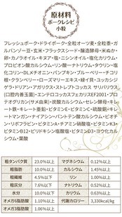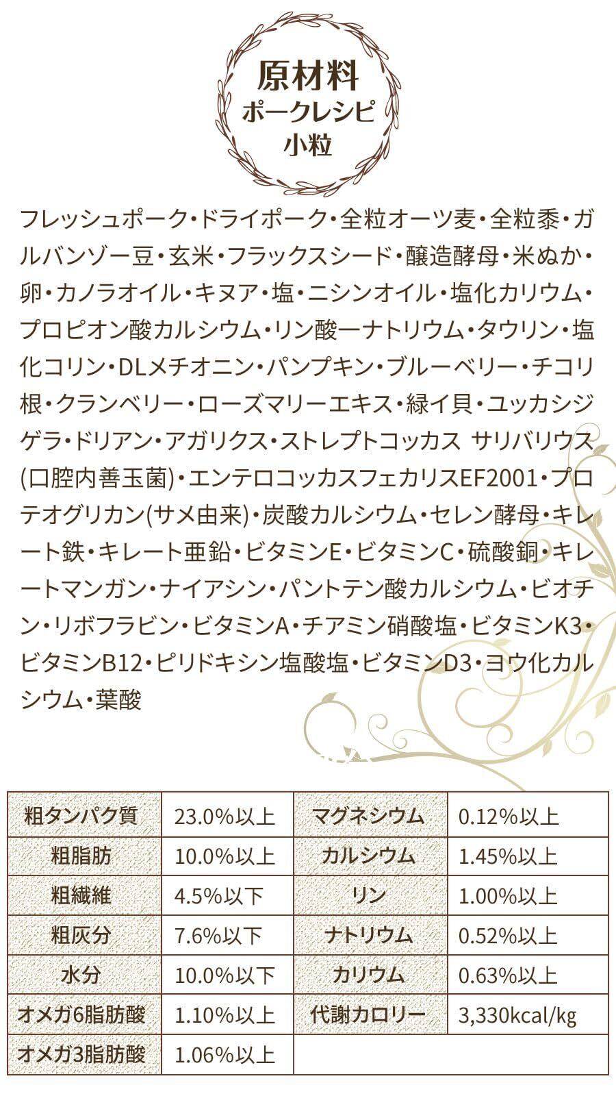 フレッシュポーク・ドライポーク・全粒オーツ麦・全粒黍・ガルバンゾー豆・玄米・フラックスシード・醸造酵母・米ぬか・卵・カノラオイル・キヌア・塩・ニシンオイル・塩化カリウム・プロピオン酸カルシウム・リン酸一ナトリウム・タウリン・塩化コリン・DLメチオニン・パンプキン・ブルーベリー・チコリ根・クランベリー・ローズマリーエキス・緑イ貝・ユッカシジゲラ・ドリアン・アガリクス・ストレプトコッカス サリバリウス(口腔内善玉菌)・エンテロコッカスフェカリスEF2001・プロテオグリカン(サメ由来)・炭酸カルシウム・セレン酵母・キレート鉄・キレート亜鉛・ビタミンE・ビタミンC・硫酸銅・キレートマンガン・ナイアシン・パントテン酸カルシウム・ビオチン・リボフラビン・ビタミンA・チアミン硝酸塩・ビタミンK3・ビタミンB12・ピリドキシン塩酸塩・ビタミンD3・ヨウ化カルシウム・葉酸