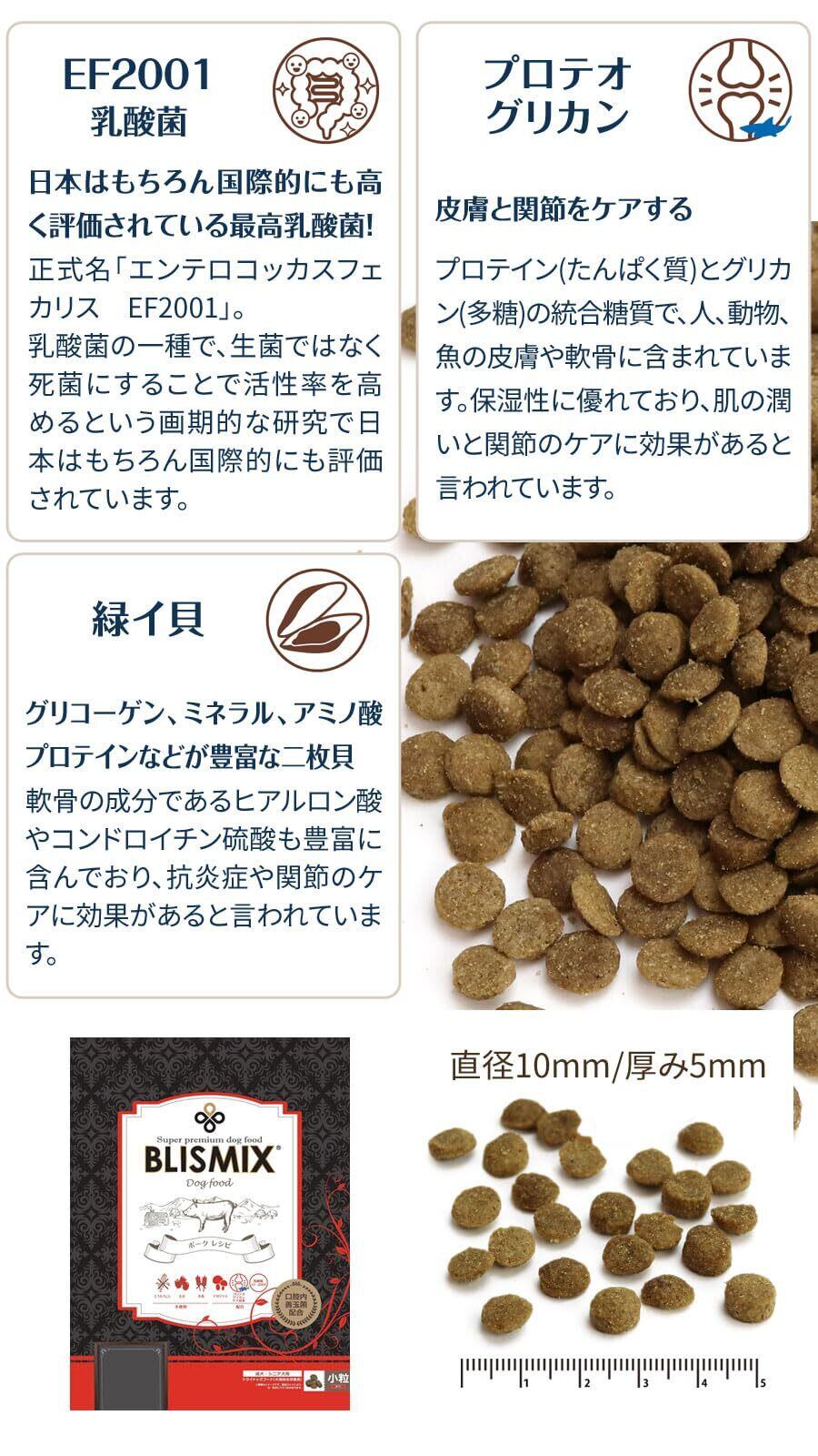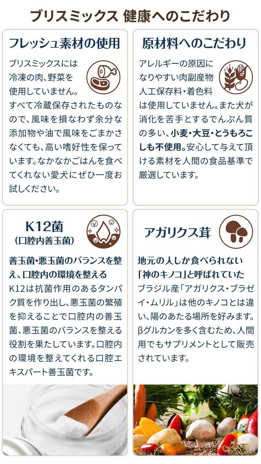 お口の状態を整えてくれる 口腔内善玉菌K12を配合、さらにアガリクス茸・乳酸菌 EF2001・プロテオグリカン・緑イ貝がプラスされています。ポークを主原材とした小粒タイプのドッグフードです。アレルギーが気になる愛犬に。ブリスミックスには冷凍の肉、野菜を使用していません。ブリスミックスは、アレルギーの原因になりやすい肉副産物・人工保存料・着色料は使用していません。犬が消化を苦手とするでんぷん質の多い、小麦・大豆・とうもろこしも不使用。愛犬に安心して与えて頂ける素材を人間の食品基準で厳選しています。