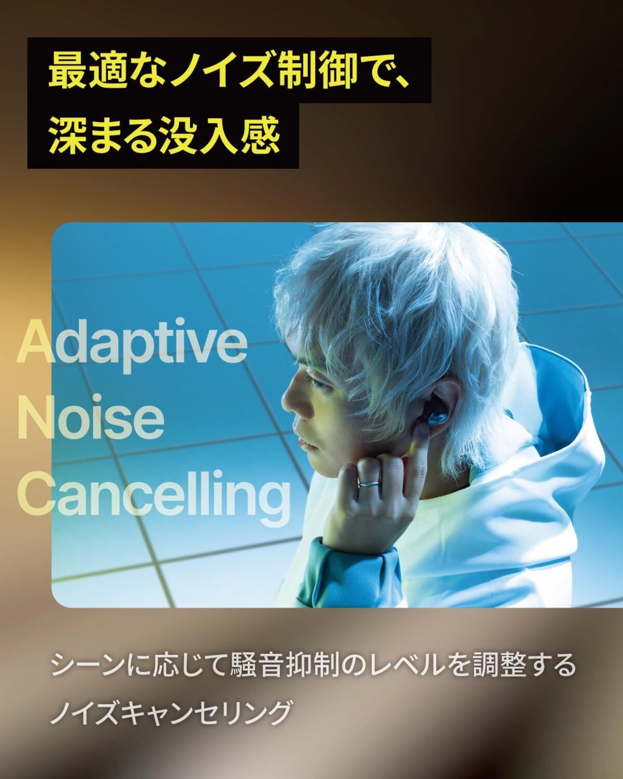 進化した”アダプティブハイブリッドノイズキャンセリング”で シーンに応じて騒音抑制のレベルを調整 :周囲の状況に応じて騒音抑制の強度を自動的に調整する”アダプティブハイブリッドノイズキャンセリング”を搭載。 さらに、”TE-W1”の迫力ある重低音と、クリアな中高音を際立たせるため、AVIOT独自のアルゴリズムを採用。音楽のビートに干渉する帯域を中心にノイズを除去、さらに騒音でかき消されやすい低中音域を広帯域で軽減。