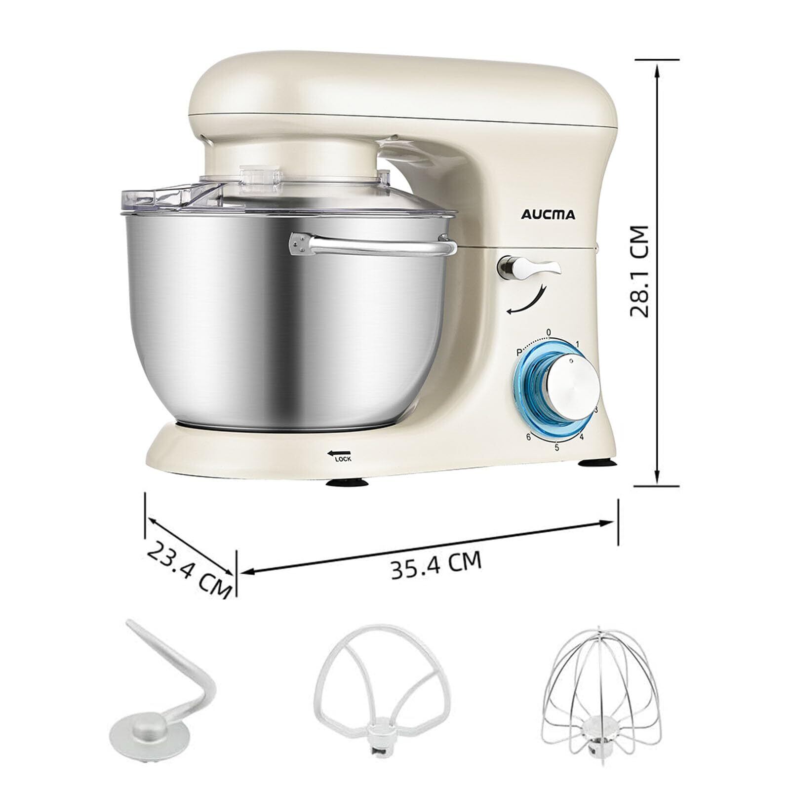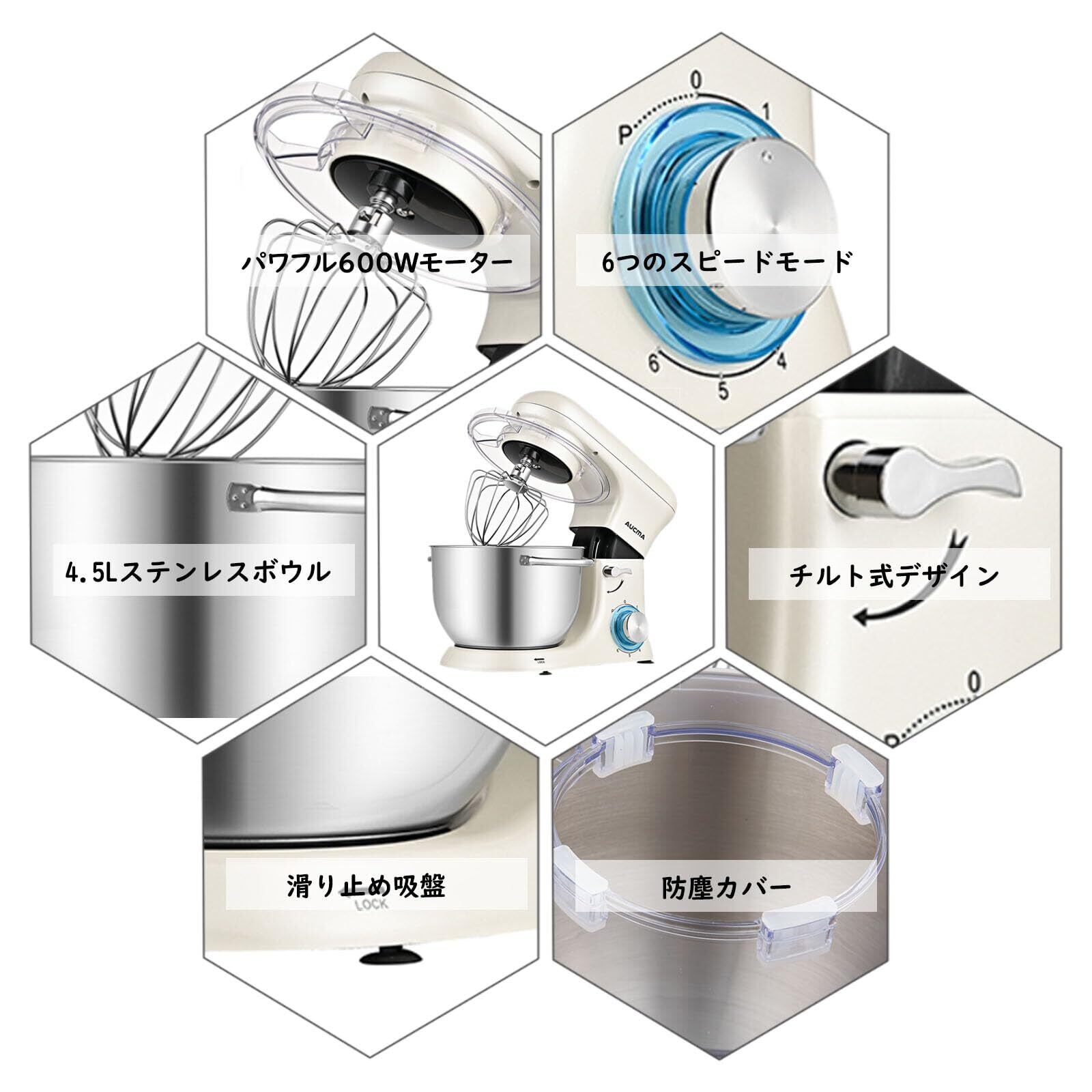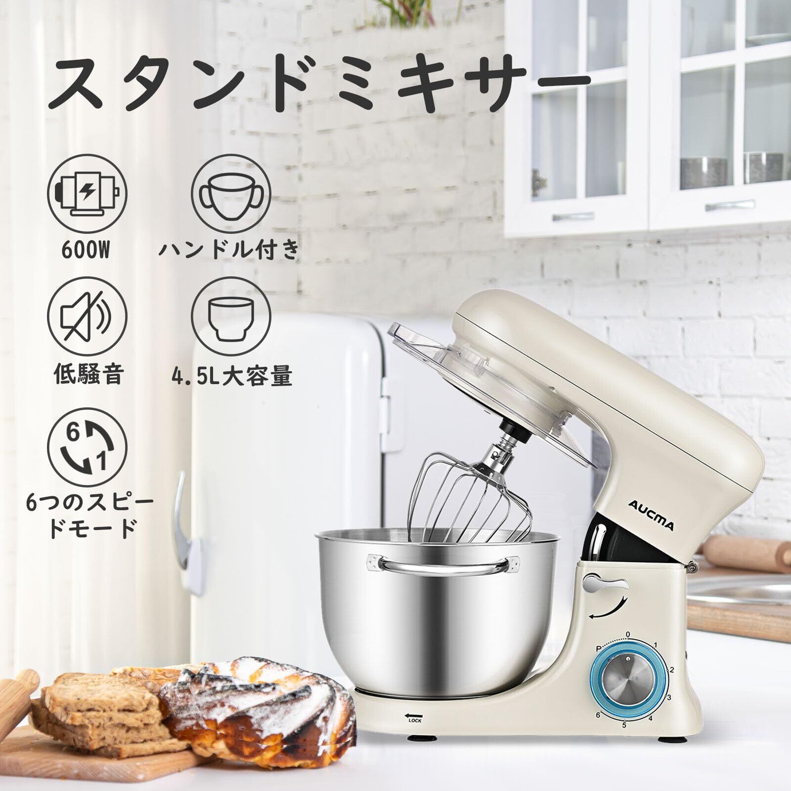 Aucma スタンドミキサー 4.5L大容量 3種類アタッチメント付き 低騒音 6段階スピード調節 家庭用 業務用 生地 こねる 多機能 ミキサー 電動 お菓子 パン 手作り キッチン フードプロセッサー 卓上型ミキサー 業務用ミキサー (4.5L、ベージュ)