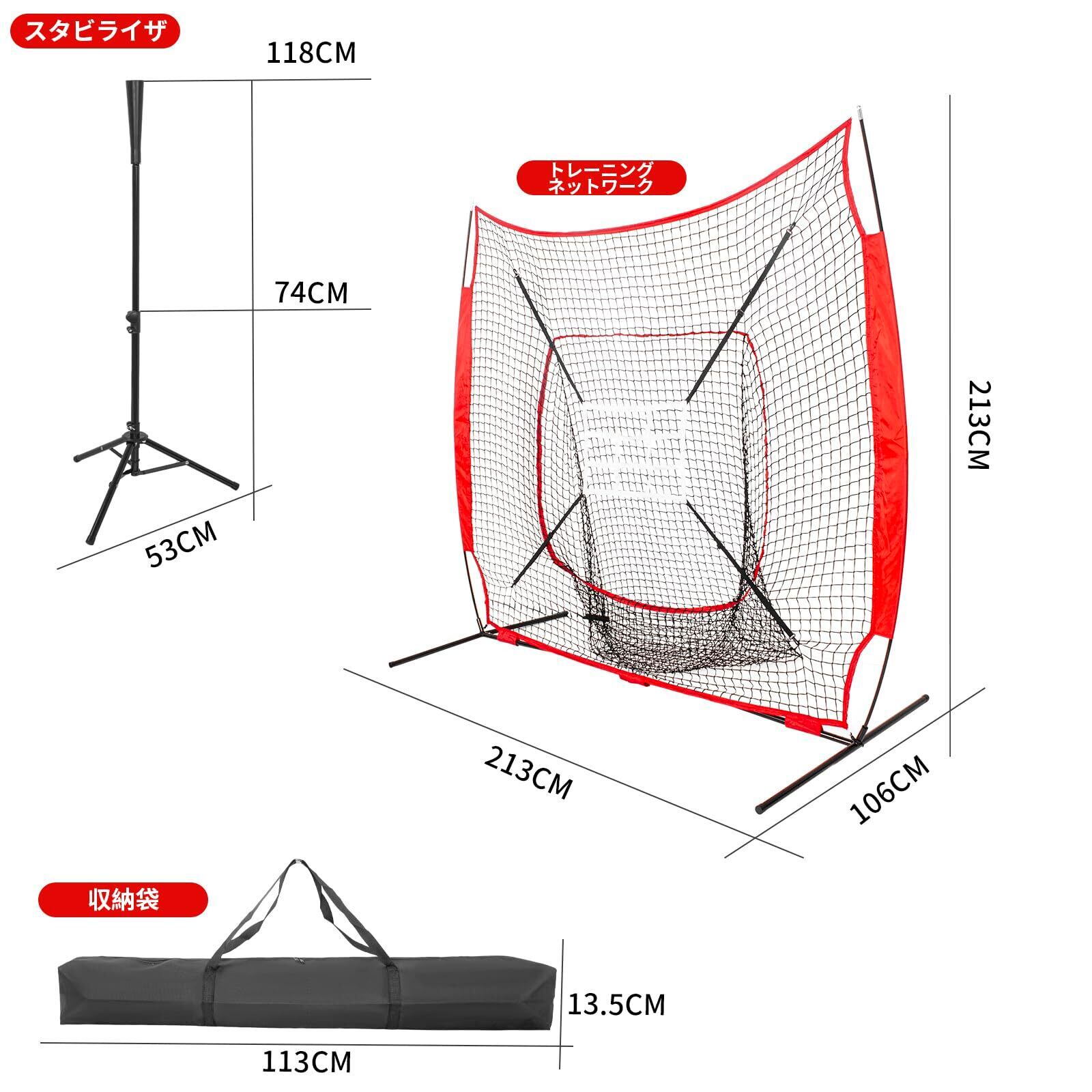 材質:フレーム/スチール、グラスファイバーポール、ネット/ポリエステル、収納袋/オックスフォード。 展開サイズ:幅213×奥行102×高さ213CM。【セット内容】バッティングネット、バッティングティー、2個練習用ターゲット(九宮格)、フレーム、パイプ、固定用釘、収納バッグ、日本語取扱説明書。