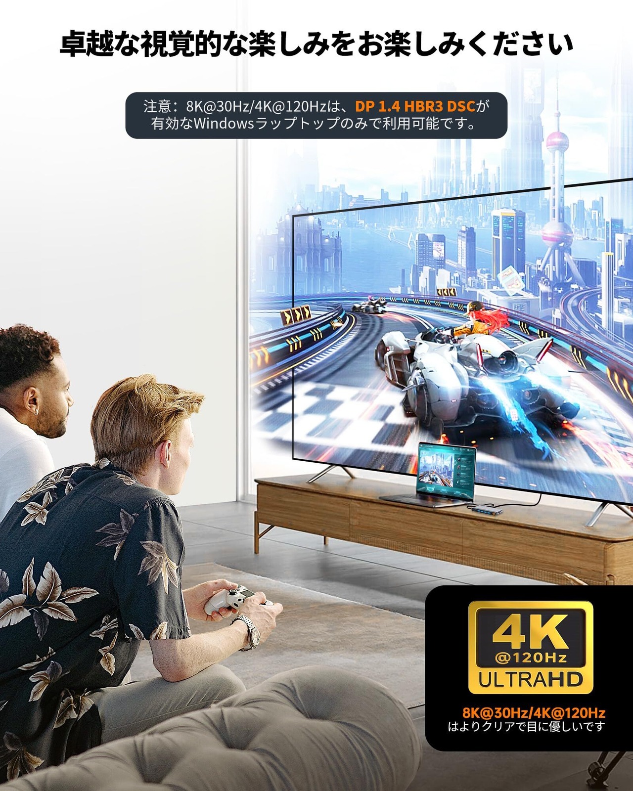 【40cm延長ケーブル 4画面 14in1 8Kドッキングステーション】1つのプラグで14の機能を広げる究極のUSB Cドッキングステーションです。USB C ハブ ダプターで、1つのUSB C/Thunderbolt 3/4/USB Type Cから8K DP、2*4K HDMI、VGA、4*USB 3.0(5Gbps)、USB C 3.0、PD 100W、SD&TFカードリーダー、3.5mmオーディオ、ガビットイーサネットなど多彩なポートが利用可能です。 このFujitsu ドッキングステーションで、仕事が効率的に進みます。プロ仕様のパフォーマンスとシームレスな接続で、ビジネスがよりスムーズにします。 ご注意: 注文する前に、ラップトップのType CソースポートがThunderbolt 3/Thunderbolt 4/DP Alt モードをサポートしていることを確認してください。