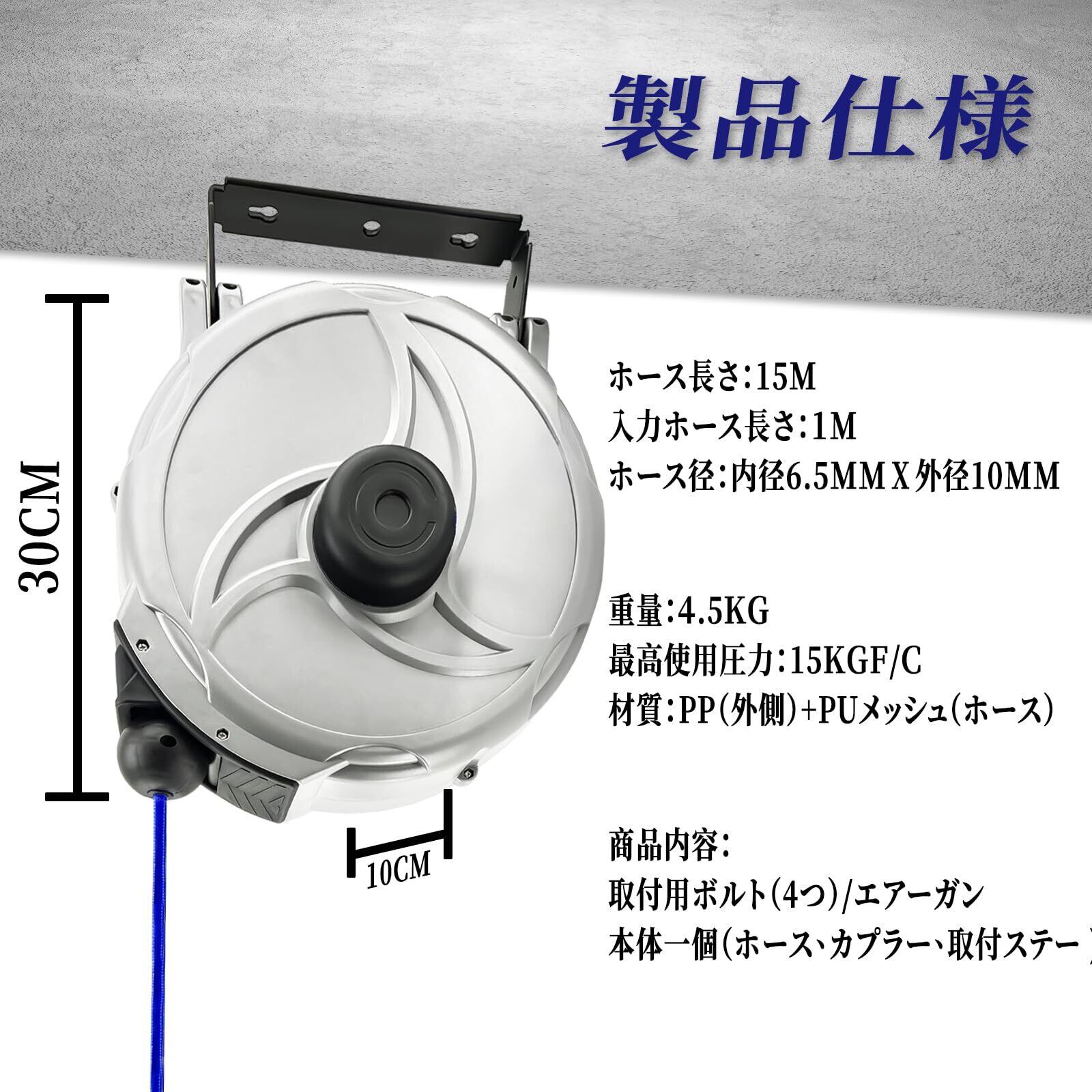 CXCESNS エアホースリール 自動巻取式 15m 自動巻き上げ ブラケット付 壁掛け 天吊り式 エアホース 180°回転可能 ホース外径φ10mm×内径6.5mm 空気圧工具 オート引き込み式 日本語説明書付き