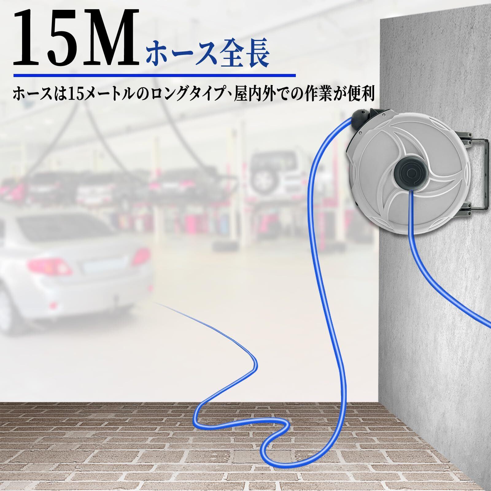 【15mのロングサイズ】ホースは全長15メートルで、屋外作業でも十分に対応可能。コンパクトなデザインで移動時にも持ち運びやすく、自動車整備工場などの場所での利用に適しています。