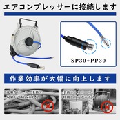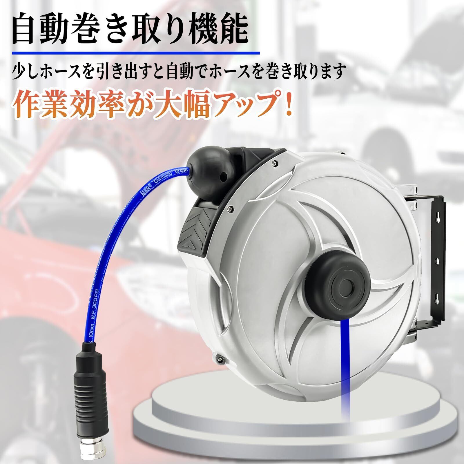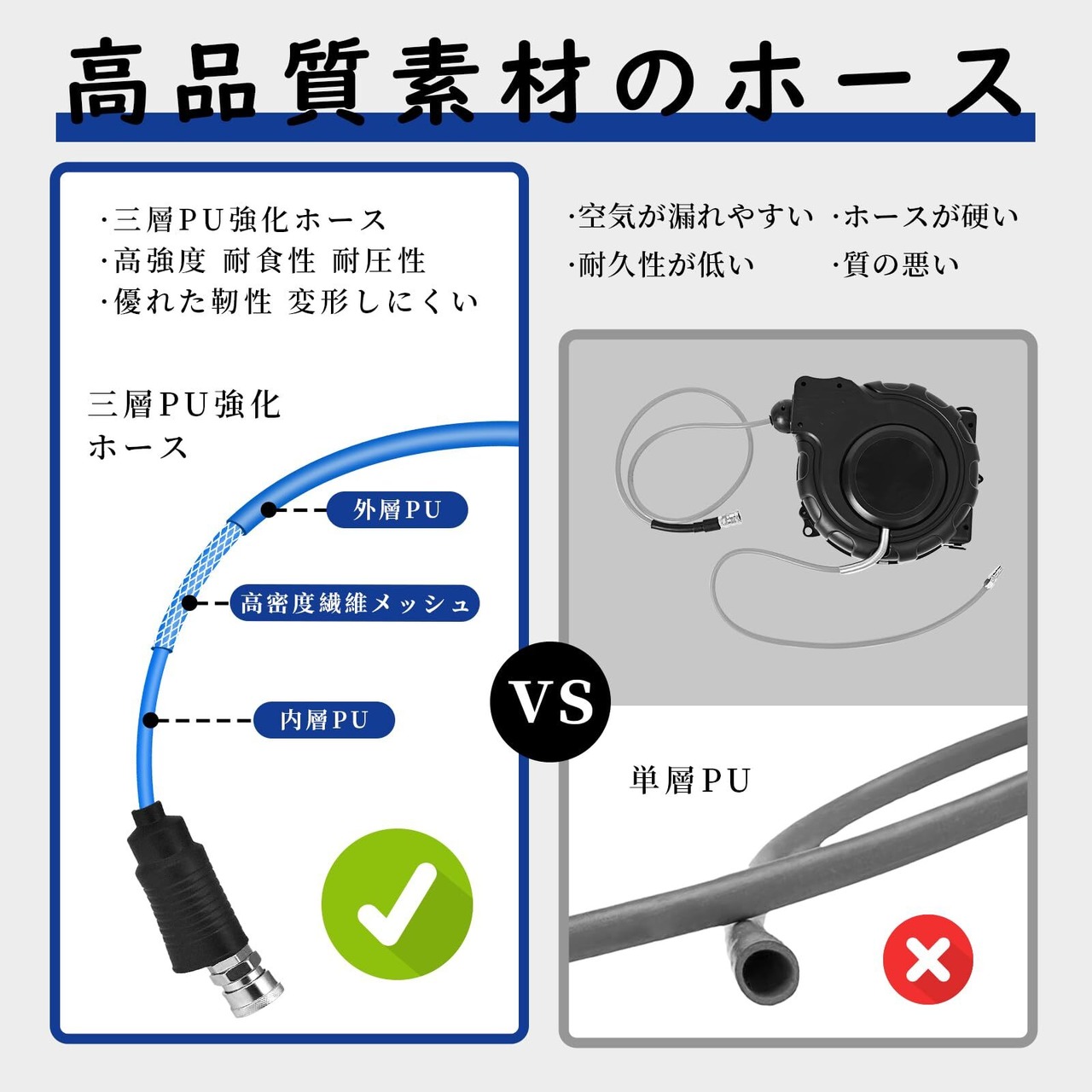 自動巻き取り機能】エアーホースは必要な長さに自由に調節可能、使用後は軽く引くだけで自動的に巻き取られます。過度の巻き取りを防ぐストッパー付きで、作業効率化が大幅にアップできます。