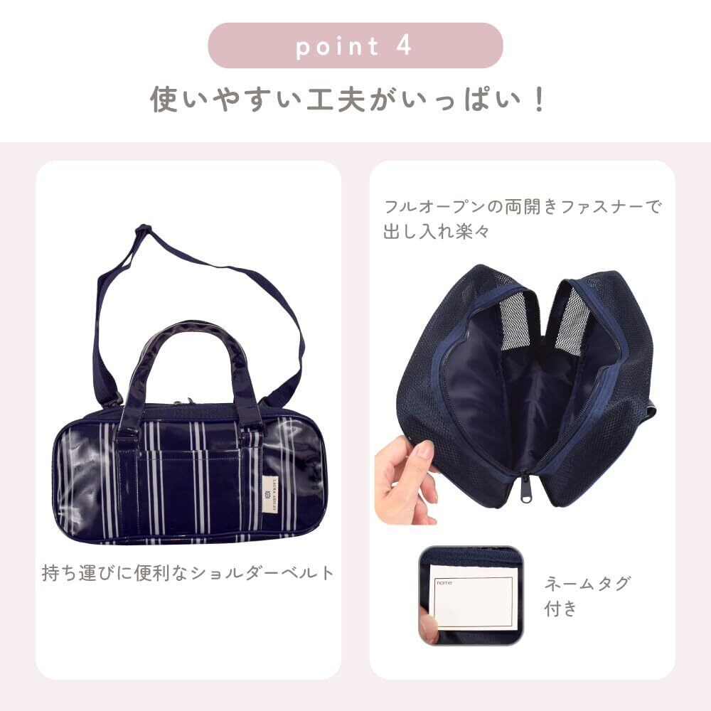 通気性の良いメッシュ生地&撥水生地を使用。サイドは全面メッシュ生地なので通気性も抜群。中に残りがちな水分を逃しカビを予防します。内側は撥水生地を使用しています。