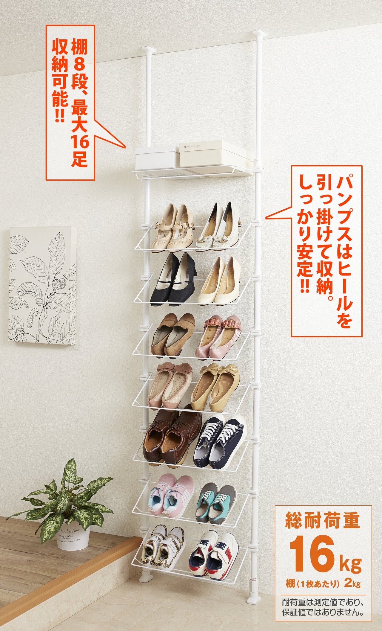 ●棚は全部で8段。最大で16足の収納が可能です。