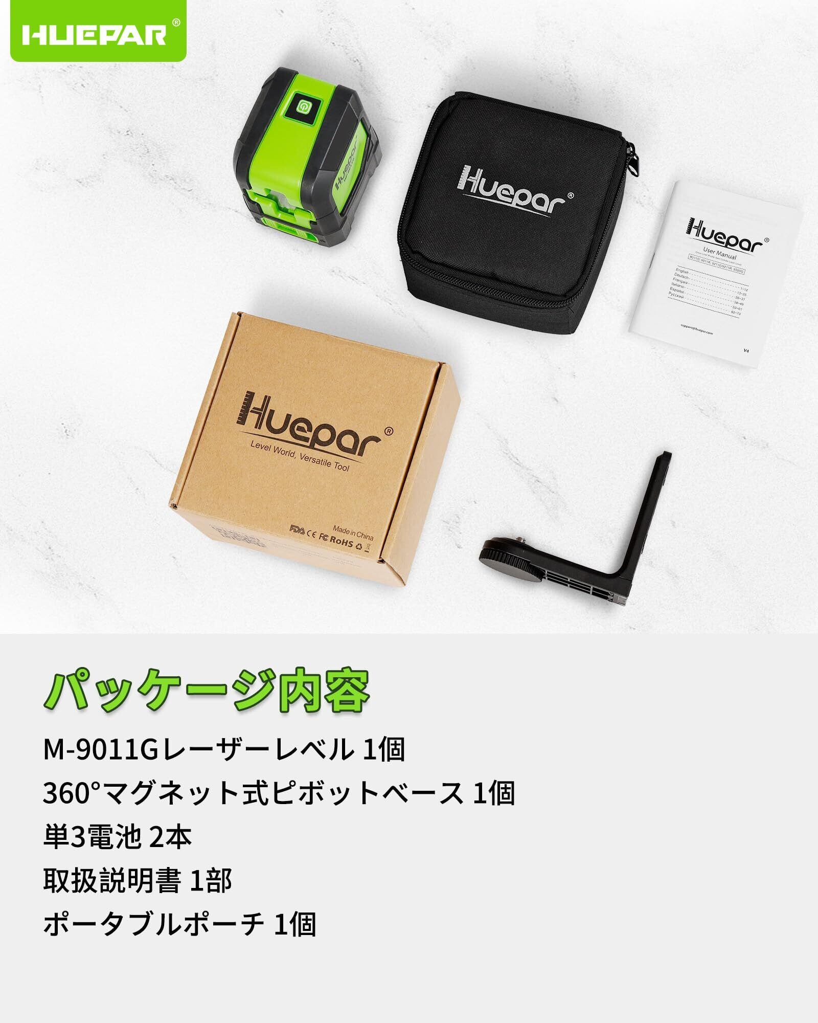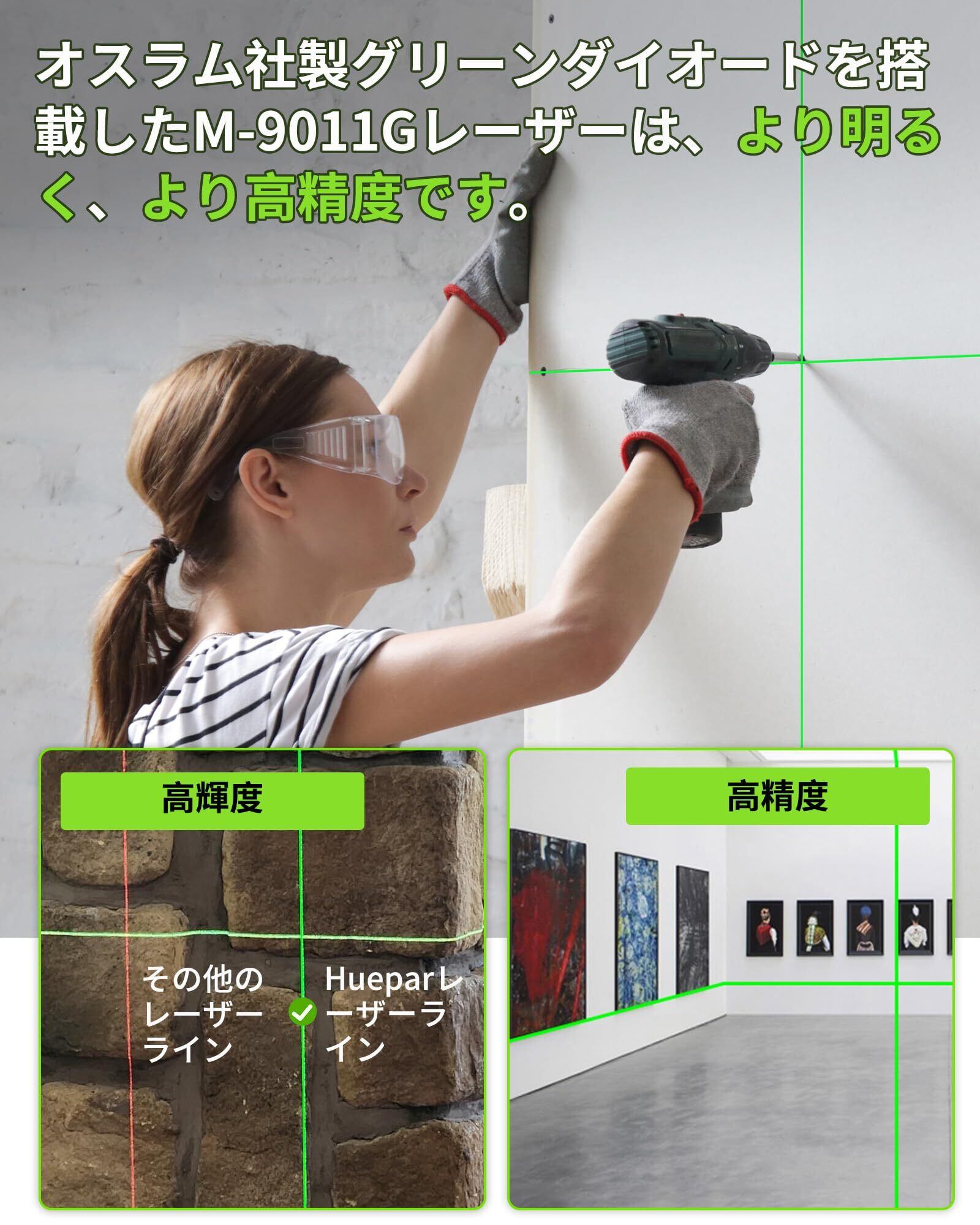 Huepar 2ライン グリーン レーザー墨出し器 クロスラインレーザー 緑色 レーザー 自動補正 傾斜モード 高輝度 ライン出射角110° ミニ型 操作簡単 マグネットベース付き M-9011G