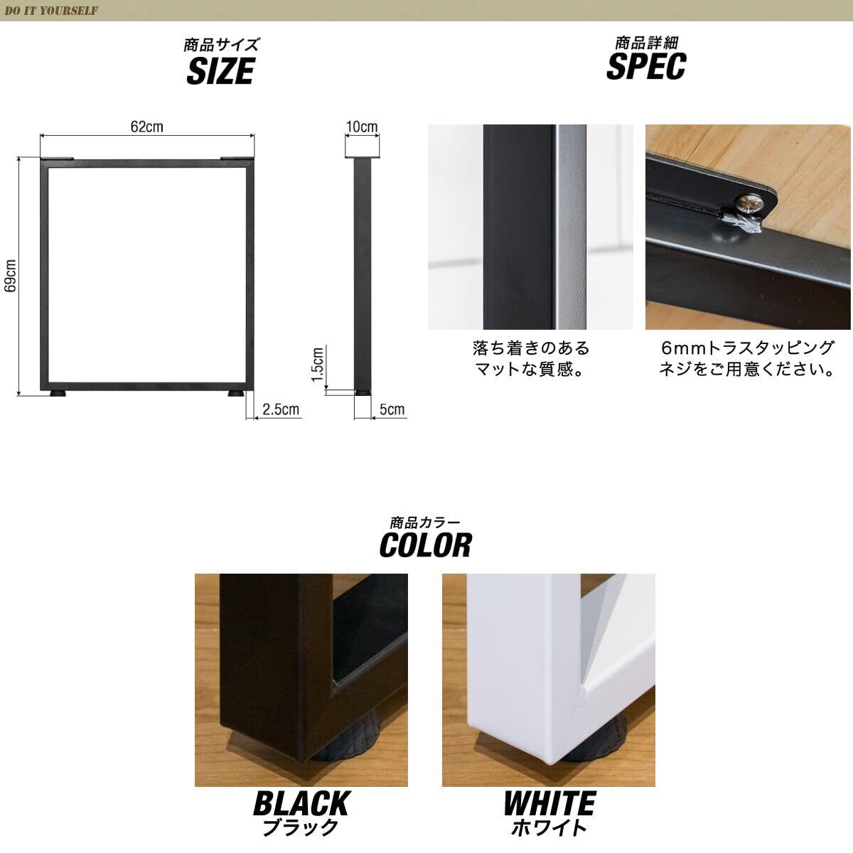 【商品詳細】 サイズ: (約)幅10cm×奥行62cm×高さ69cm 材質: スチール 重量: (約)9.3kg ※2本分 対応ネジ: 6mmトラスタッピングネジ ネジ取付箇所の厚み: 5mm 必要なネジの本数: 16本 特記事項: ※天板・ネジは付属しません。 ※本製品とそこに載せる天板の厚みを考慮した長さのネジをご用意ください。 ※天板に下穴を開けてからネジを取り付けてください。 ※天板の素材や大きさ・厚み等によって耐荷重は異なります。