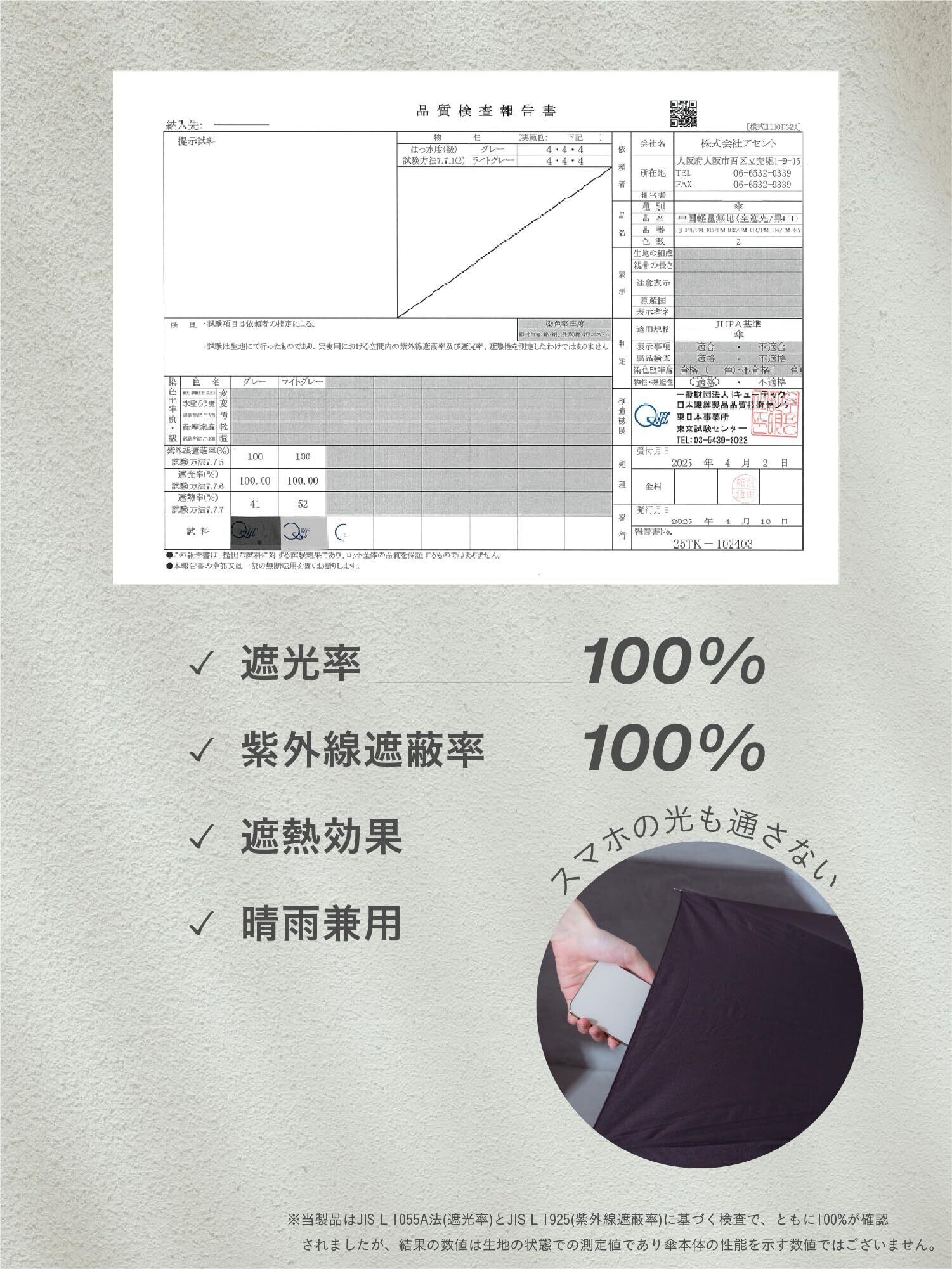 【夏の日差しも怖くない遮光率・UVカット率100%生地】 遮光率・紫外線遮蔽率ともに100%の生地を使用(※)。また、近赤外線遮蔽率も100%、遮熱効果もあり、日傘として最高レベルの効果があります。