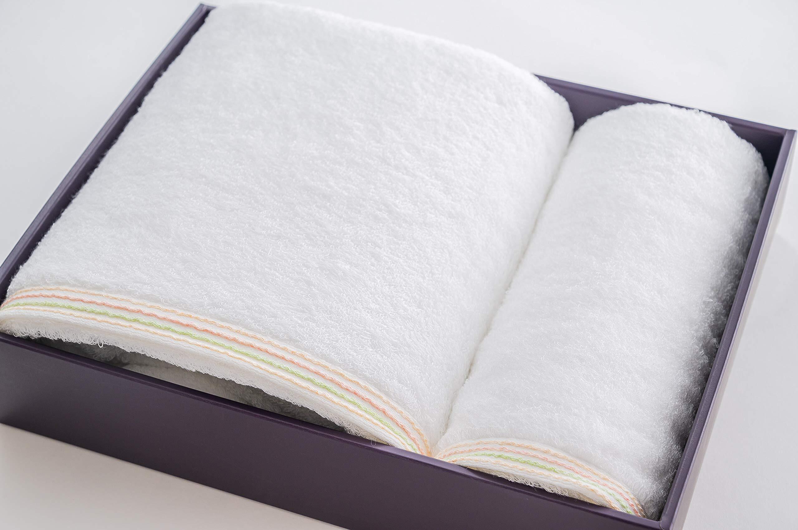 【バスタオル 1枚 フェイスタオル 1枚 セット】生産国:日本製(今治市) 素材:綿100% サイズ:約60×120cm 重さ:1枚あたり約296g サイズ:約34×90cm 重さ:1枚あたり約128g カラー:ホワイト 化粧箱サイズ:約28×36×7.5cm