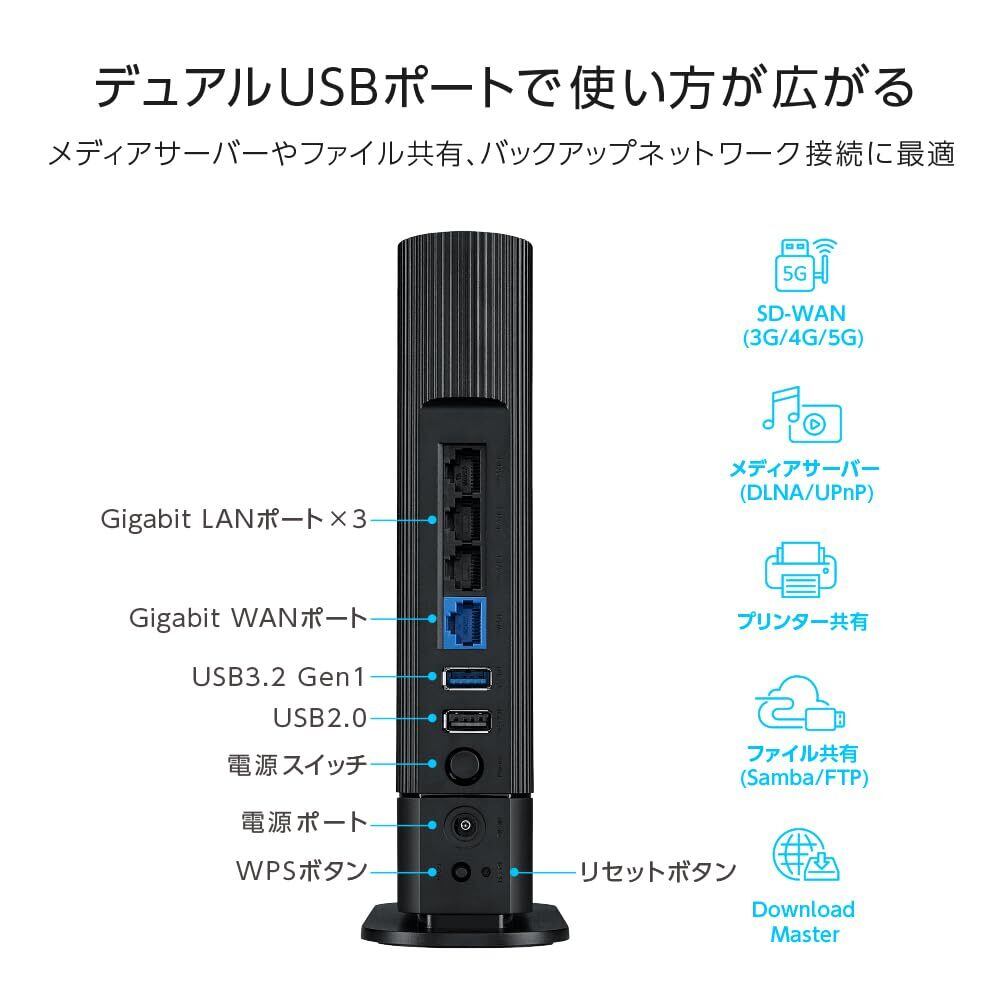 ■USBポート x2ポート搭載- インターネットサービスにアクセスできない場合、バックアップのネットワークにアクセスすることが可能。USBポートを4G/5GのUSBモデムに接続してバックアップWANとして設定したり、Android端末をモバイルホットスポットとして使用したりすることが可能。