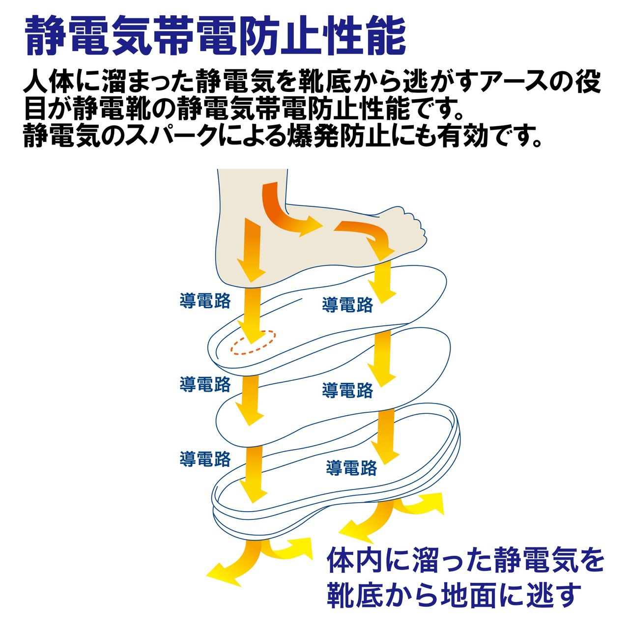 【静電気帯電防止性能】人体に溜まった静電気を靴底から逃がすアースの役目が、静電靴の静電気帯電防止性能です。静電気のスパークによる爆発防止にも有効です。
