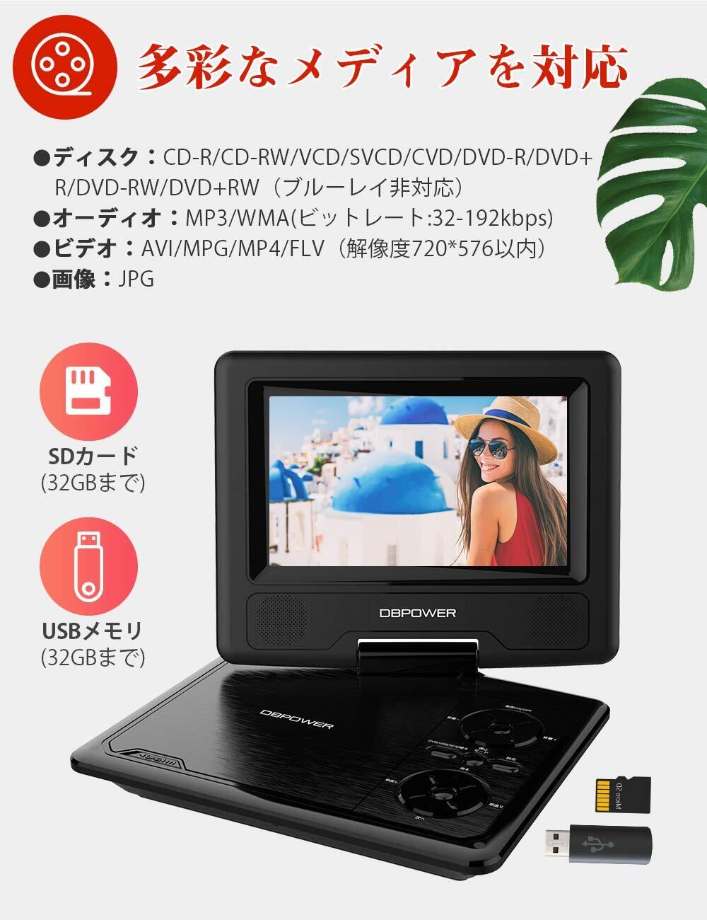 【在庫セール】DBPOWER ポータブルDVDプレーヤー 7.5インチ 5時間連続再生 3電源対応 レジューム機能 270度回転 リージョンフリー CPRM対応 TVと同期可能 SD/MS/MMCカード/USBに対応 リモコン付き 日本語説明書付属 (ブラック) | ニコニコSHOP