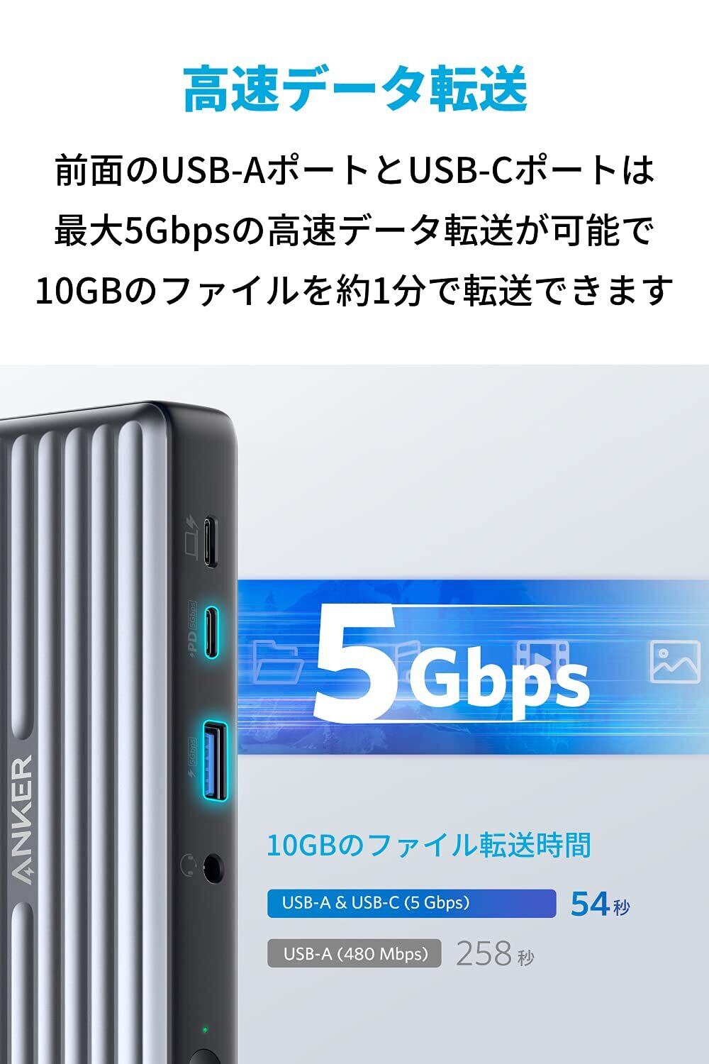 高速データ転送:前面のUSB-AポートとUSB-Cポートはそれぞれ最大5Gbpsの高速データ転送に対応し、動画ファイルや音楽のプレイリストなどを即座に同期することが可能です。