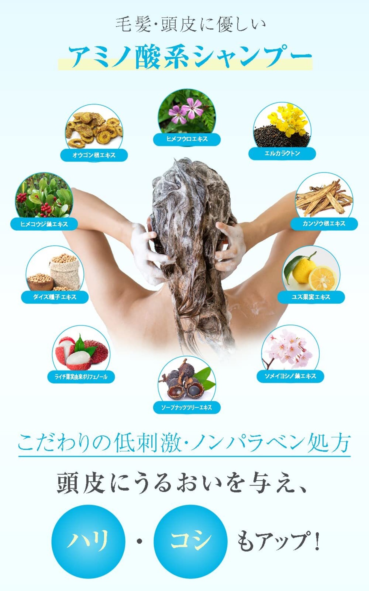 【特徴】ノンパラベン・ノンシリコン・ノンカチオン界面活性剤。頭皮にやさしいアミノ酸系ベースの処方にリニューアルしました。泡立ちは控えめになりましたが、より頭皮のことを考えたシャンプーになりました! 油分(ワックスなど)があると泡立ちにくいので、その場合は一度お湯で前洗いしてのご使用をおすすめいたします。