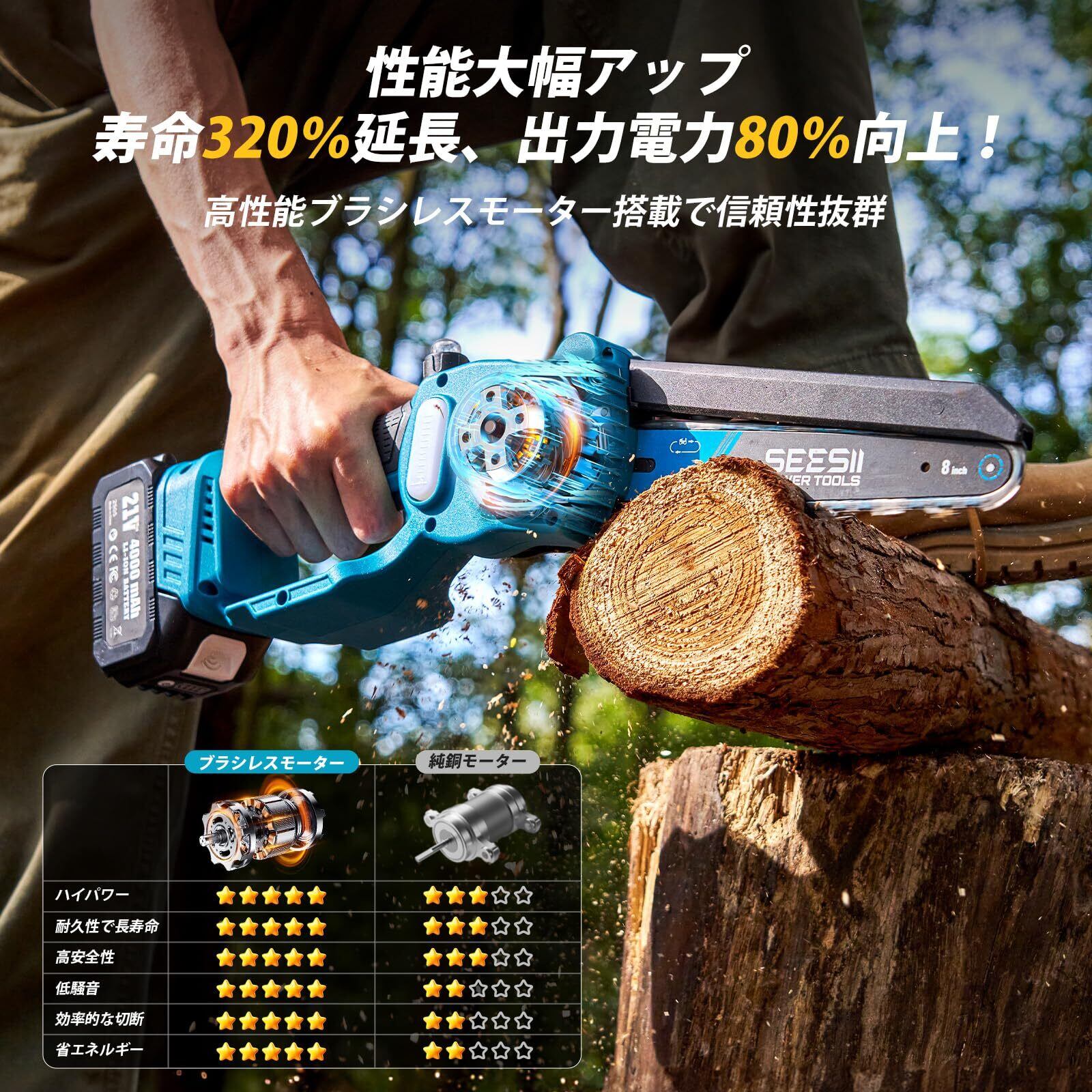 ️【ブラシレスモーター・高効率切断電動チェーンソー】SEESII 充電式 8 インチチェーンソー M8G は、ブラシレスモーター搭載で、ブラシ式モーター比べ、寿命は 320%延長、出力電力は 80%向上、エネルギー消費量は 50%削減します。作動時に火花発生なくモーター摩耗を抑制し、長寿命と高効率を実現します。補助ハンドルにより、直径 200mm の丸太を 10 秒で切断可能で、作業の時間と労力を大幅に軽減します。さらにオイル注入口搭載によるスムーズな給油機能で、木材・竹の切断、薪作り、庭木の剪定など多様なシーンで活躍します。