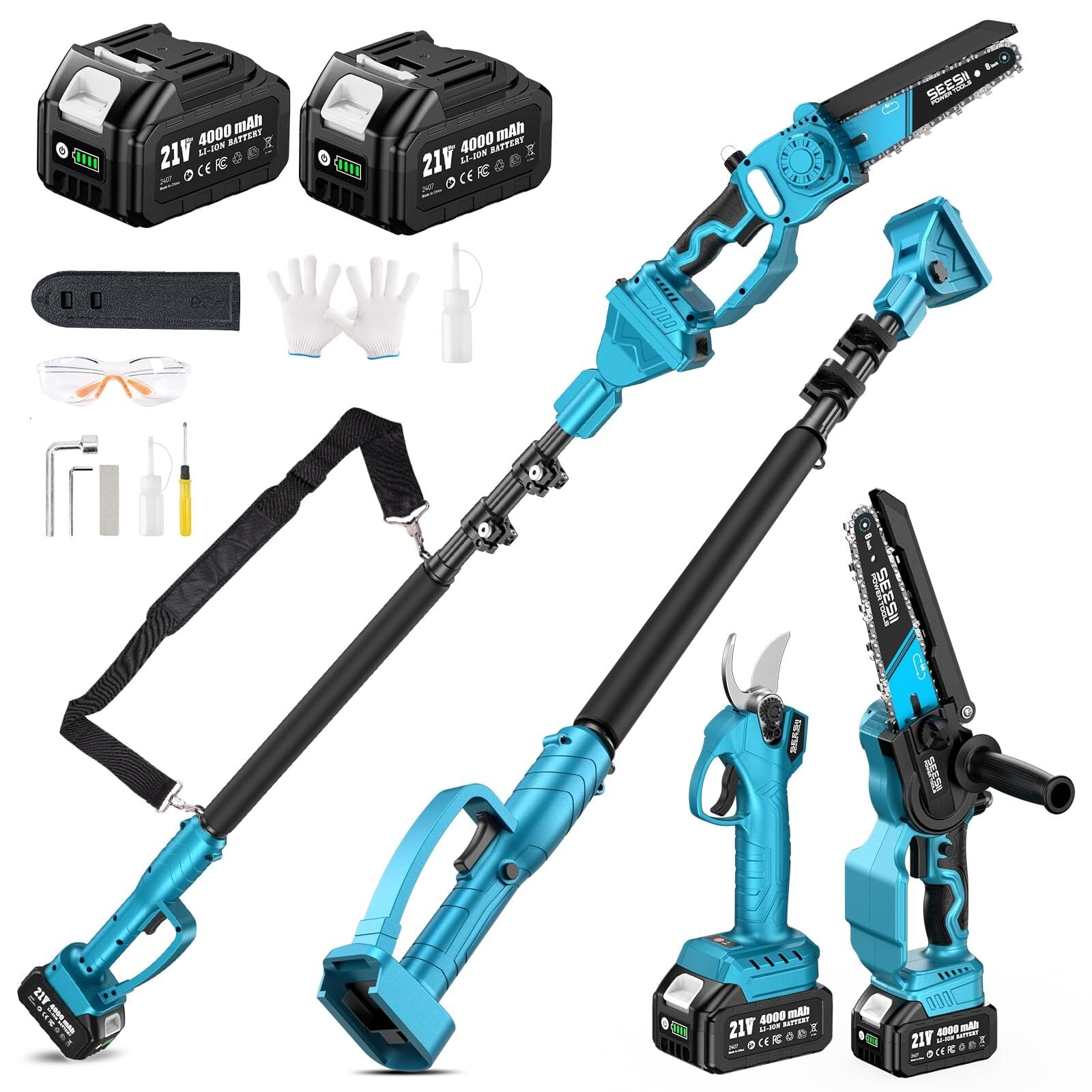 【2025年新登場】SEESII 高枝チェーンソー&電動バサミ 8インチ コードレス充電式チェーンソー 高枝剪定用 1台4役 軽量ブラシレスモーター搭載 自動給油機能付き 伸縮ポール(125cm〜250cm無段階調整) 強力剪定・伐採用 4.0Ah大容量バッテリー2個付き