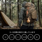 【使用場面】工場での徹底した品質管理、90日間の保証。ハイキング、キャンプ、登山、1泊2日、旅行、サイクリング、トレッキングなど様々なシーンで活躍。防災・避難用にも最適!